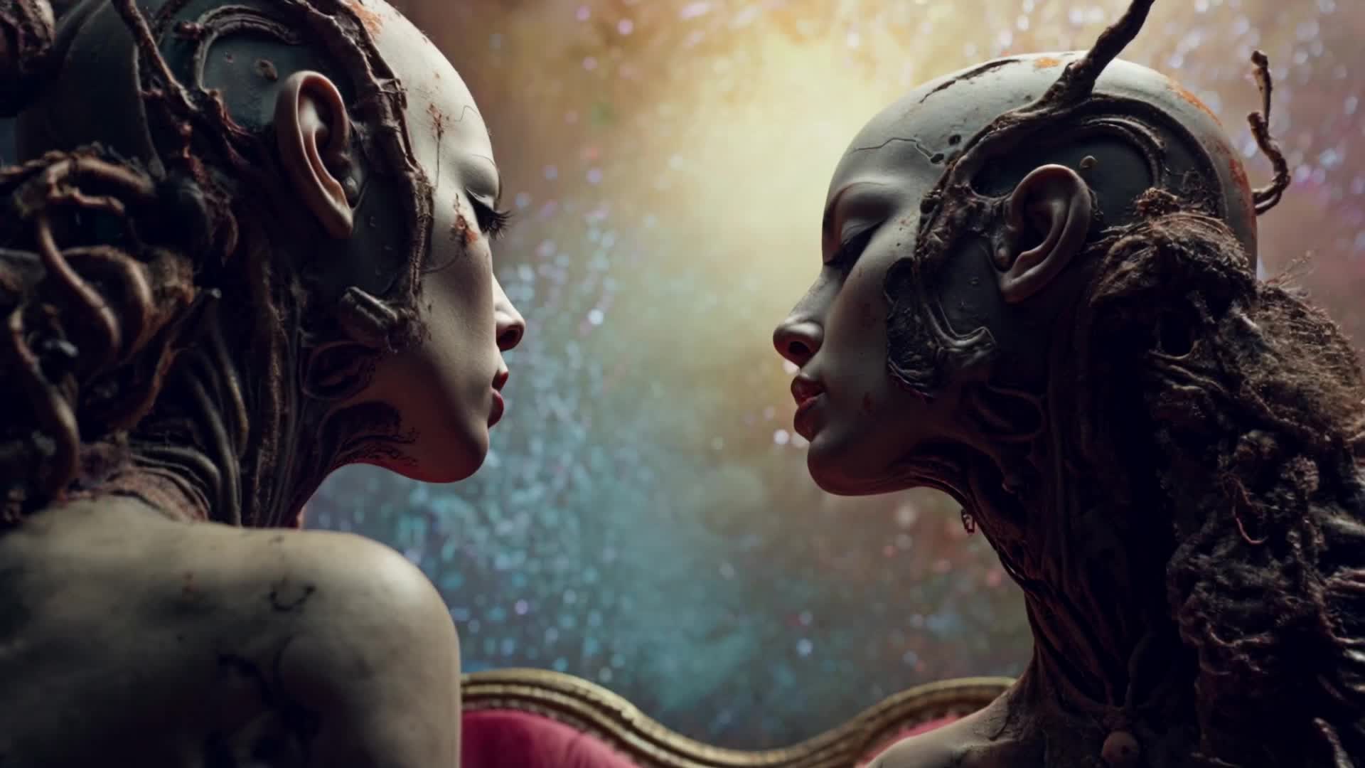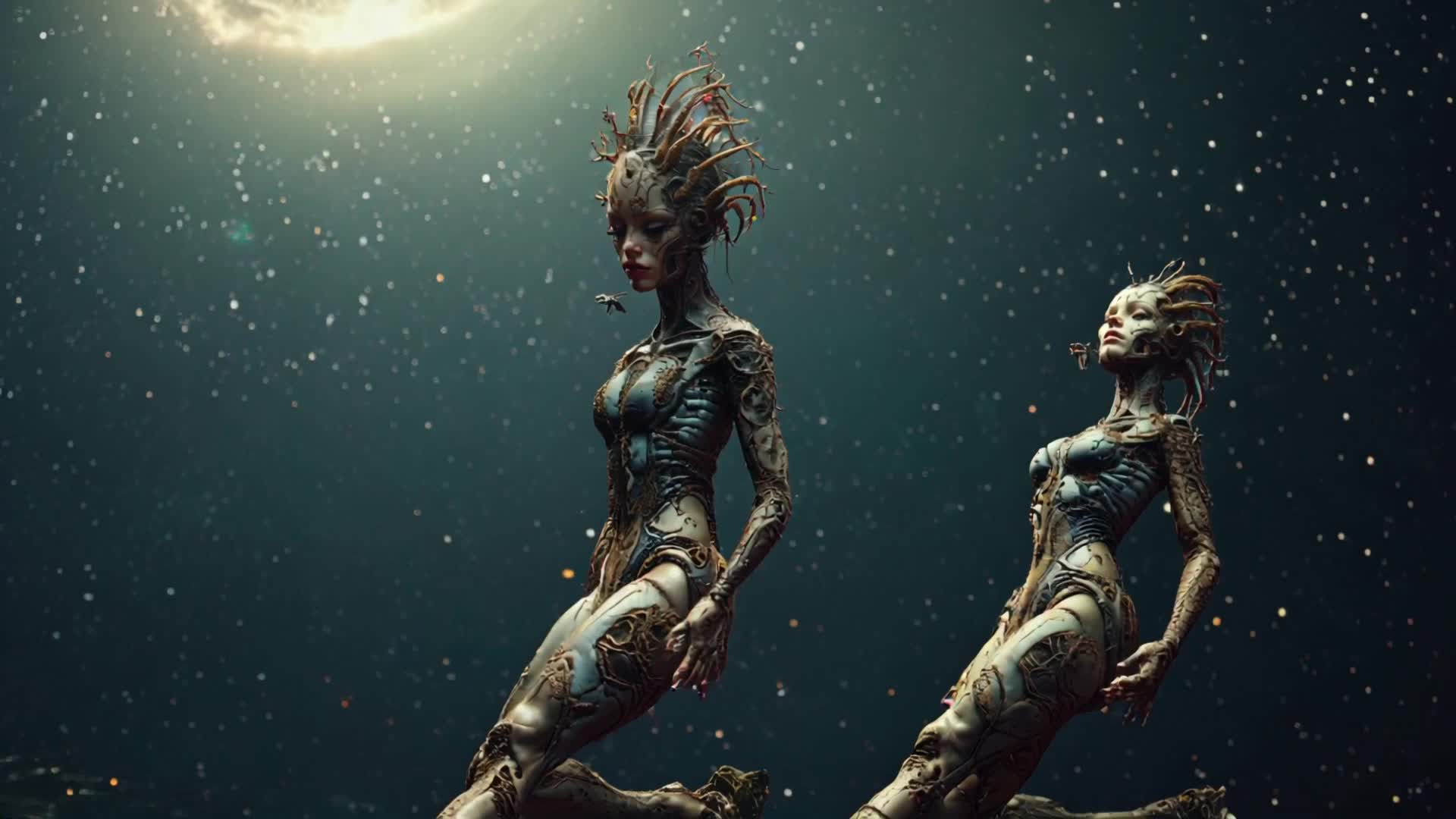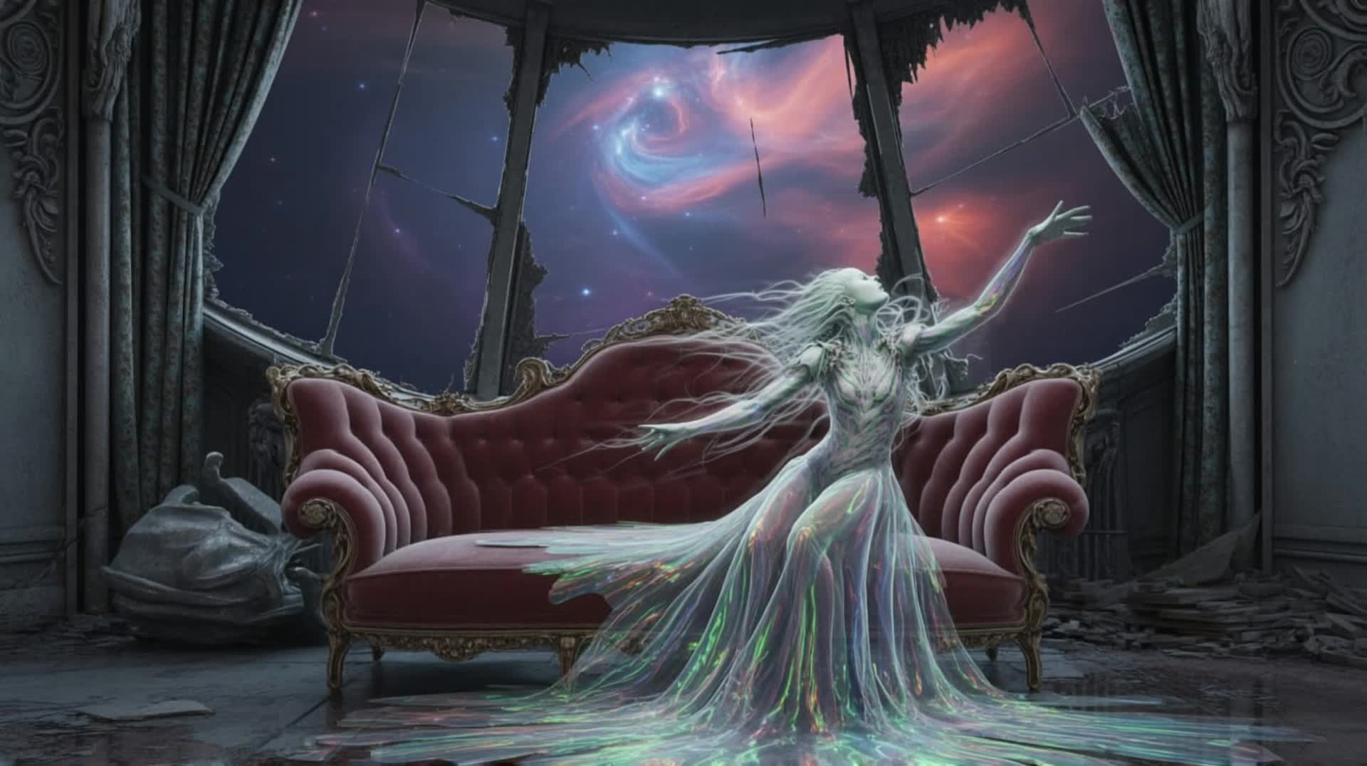 layered clean guitars, glockenspiel, organ pads, soft bass, tribal drums, gradual build-up, cinematic, mystical, ends with fade-out, Prog-Rock-Modulationszillator-Vintage 1960er Teisco Echo Box Röhrenverstärker Reverb Unit Red Swirl Tolex eine frau aus spinnwaben mit guitarcosmic dust and starlight, plays a melody that warps reality, He stands on a fractured, crystalline planetoid, bathed in the ethereal glow of distant, candy-colored nebulae, The style is reminiscent of psychedelic, with vibrant, swirling colors and intricate, mind-bending patterns, influenced by the visualizers of classic Krautrock bands and the surrealism