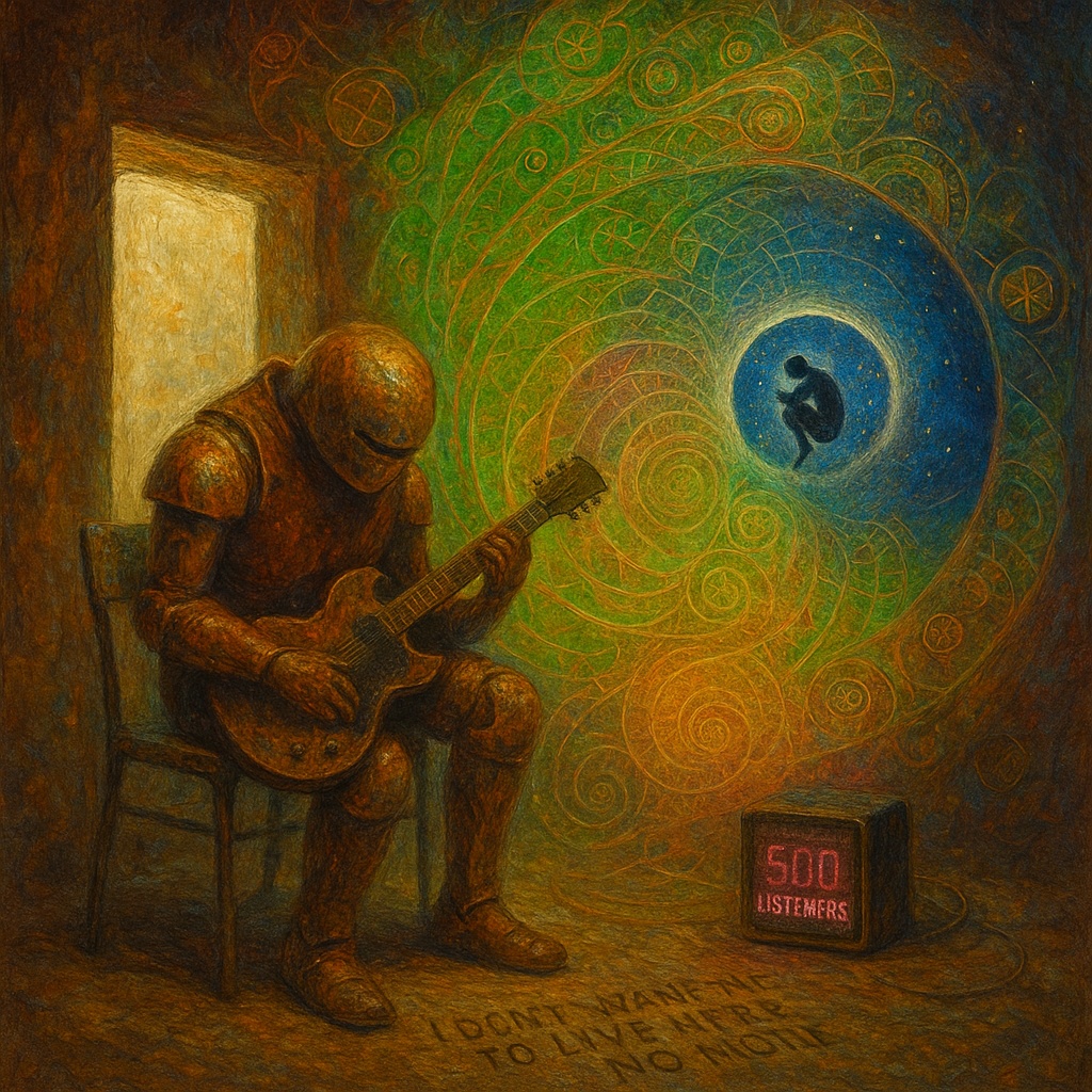 A slow, heavy nu metal groove kicks off with a creepy, gliding chiptune melody against pounding djent guitar riffs and a dense sub-bass, The introduction jolts with syncopated headbanger rhythms and unsettling electronic textures, Eerie vocal processing, inspired by utaite, threads through warped weirdcore effects, while off-kilter synths and mechanical percussion deepen the dark, creepy atmosphere