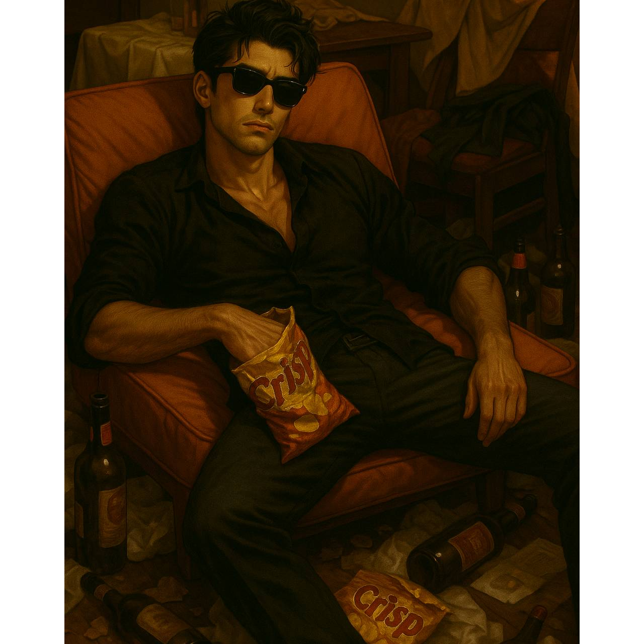 male vocals, ultra-sultry and expressive tone, whispered falsetto phrases, soft moans and tongue clicks in intro, slow-burning R&B fused with 70s funk and Euro disco, deep wet reverb, groovy slap bass, sensual funk guitar licks, analog synth stabs, ambient electric piano, smooth vocal layering with breathy harmonies, stereo-panned whispers ("Come closer, ", "Don’t stop, "), minor key progression with jazzy modal accents, erotic call-and-response backing vocals, pulsing dub groove, vinyl crackle, glitchy rhythm cuts, moody pads, timbales fills, dramatic tempo shifts, goa trance textures in bridge, glitch-hop percussive drop, "chyuuuun" riser SFX, "DA-DA-DAAAAN!" slam FX, urgent "Duh-duh-duh!" stomp SFX, breathy vocalizations (Ahhh / Hahh), jazzy scat section in middle 8, sudden mood flips from intimacy to high-energy lust, smoky bar atmosphere, neon-drenched midnight vibe, erotic tension rising through layered textures, climax with echoed shouts and deep bass rumble