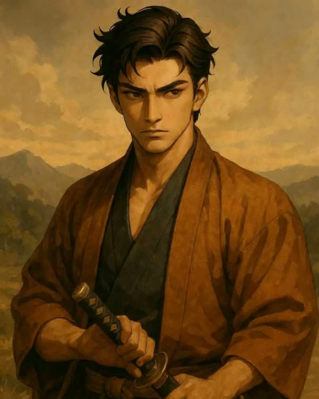 Samurai-style comic rap with shakuhachi, flute, and piano, mixed with trap beats, Includes dramatic voice, fun echo lines like "I'm so sorry", "Be nice to us", "That's awesome", and Japanese phrases like "うつけもの", "あっぱれじゃ", Starts with explosion sound, Male vocal, playful tone