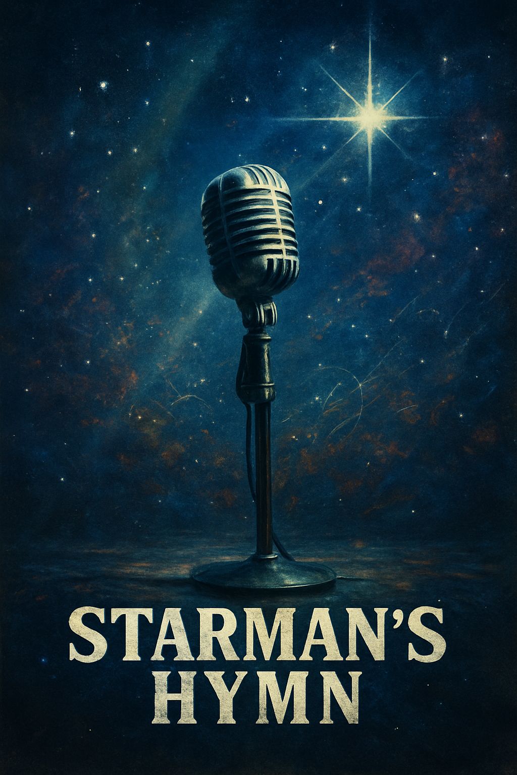 A cosmic alt-rock anthem with gritty, raspy male vocals channeling theatrical intensity and otherworldly charm, Electric guitars shimmer with delay and fuzz, weaving starlit riffs over a pulsing bass and driving drums, Verses are moody and atmospheric, carried by swirling synths and spacey textures, while pre-choruses rise with rolling toms and echoing chords, Choruses explode into soaring harmonies and cosmic distortion, evoking the grandeur of a starman’s hymn, The bridge descends into a haunting breakdown with echo-drenched vocals, synth arpeggios, and bending guitar notes before surging into a climactic final chorus, The overall sound is cosmic, rebellious, and transcendent—part glam rock, part space opera, fully alive in the sound of the stars