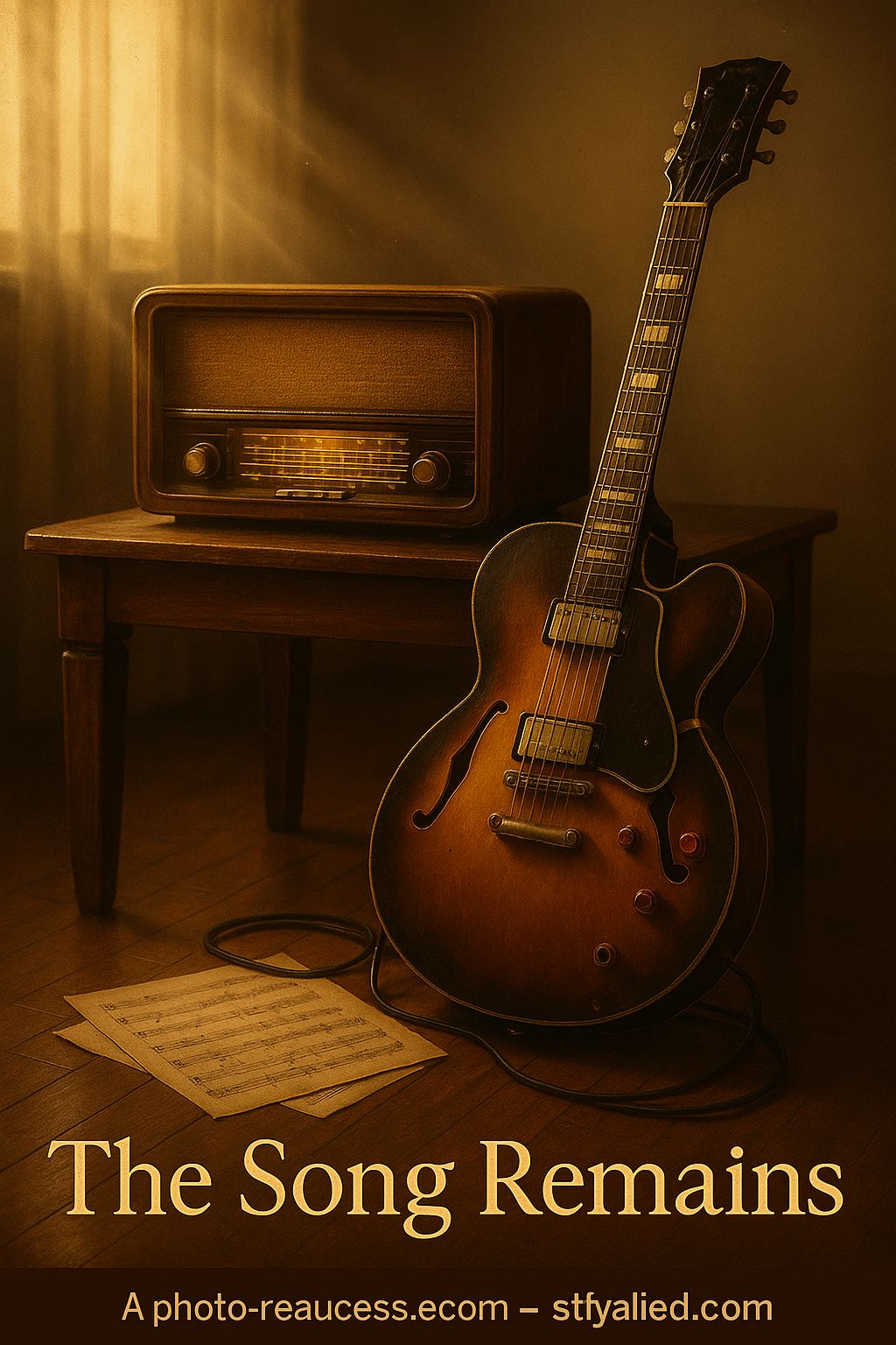 A nostalgic Americana-rock ballad with warm, raspy male vocals that blend 1950s rockabilly charm with modern cinematic production, The sound features clean electric guitars with slapback delay, upright bass, soft brush drums, and subtle organ layers, Verses are tender and reflective, carried by vintage guitar picking and an intimate vocal tone, Pre-choruses gently lift with bass and drums locking into rhythm, while choruses expand into rich harmonies, piano chords, and ambient reverb that give a timeless glow, The bridge features a classic bluesy guitar solo with smooth bends and soulful phrasing before returning to a heartfelt, gospel-tinged final chorus, The mood is wistful, sincere, and reverent—celebrating a voice that captured innocence, love, and the bittersweet beauty of time, proving that a true song never fades