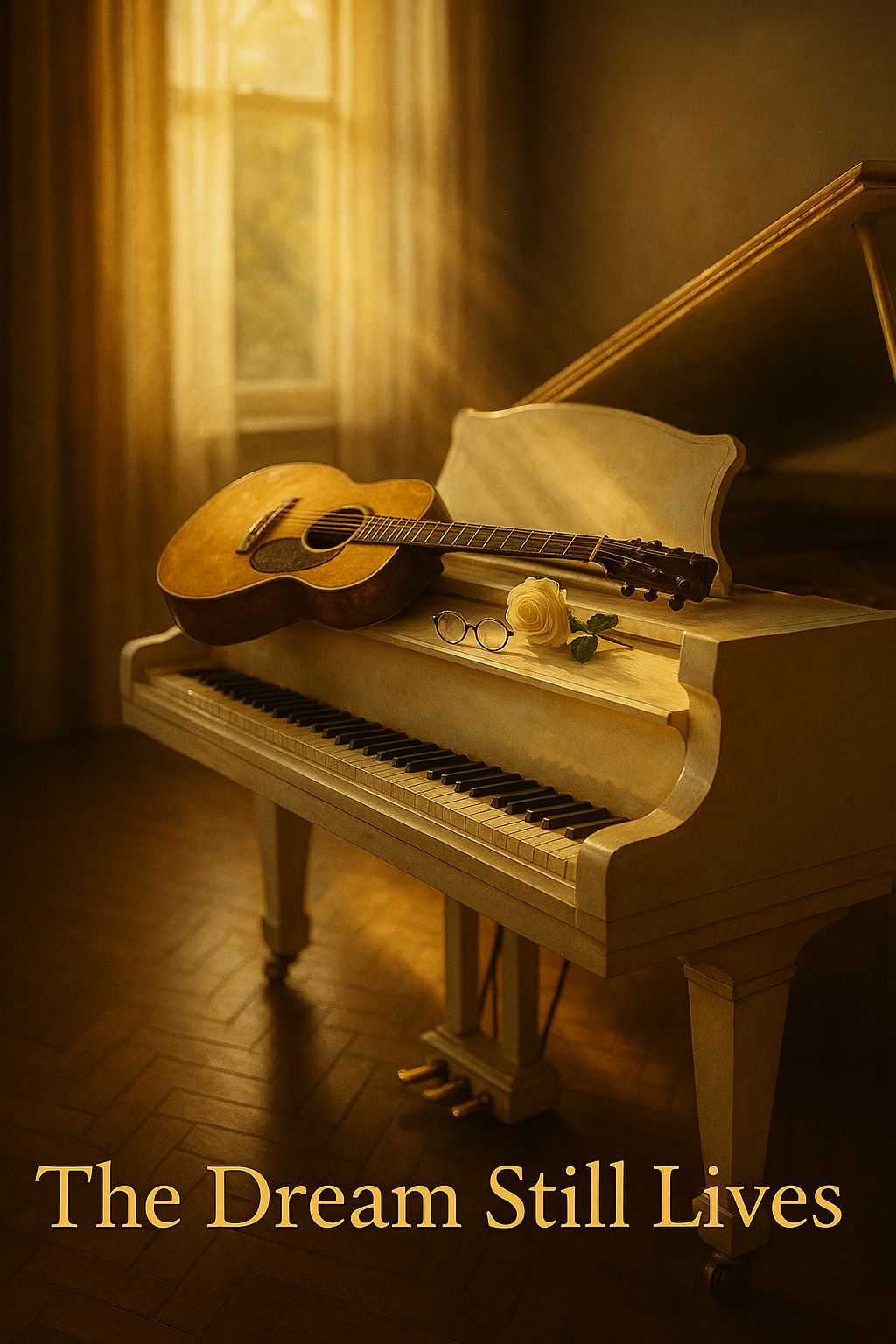 A cinematic alt-rock ballad with warm, raspy male vocals and emotional depth inspired by classic 1970s songwriting and modern atmospheric production, The song opens with soft piano arpeggios and acoustic guitar, gradually building into rich layers of electric guitars, deep bass, and steady drums, The verses are intimate and reflective, carried by heartfelt vocals and light strings, The pre-chorus adds emotional tension through swelling harmonies and subtle organ tones, The chorus blooms with cinematic energy—anthemic drums, reverb-heavy guitars, and gospel-like backing vocals that create a sense of hope and unity, The bridge slows into a spoken-sung reflection over piano and cello before a soaring final chorus, The mood is bittersweet, timeless, and reverent—honoring a voice that preached peace, love, and truth while carrying forward the dream that still lives