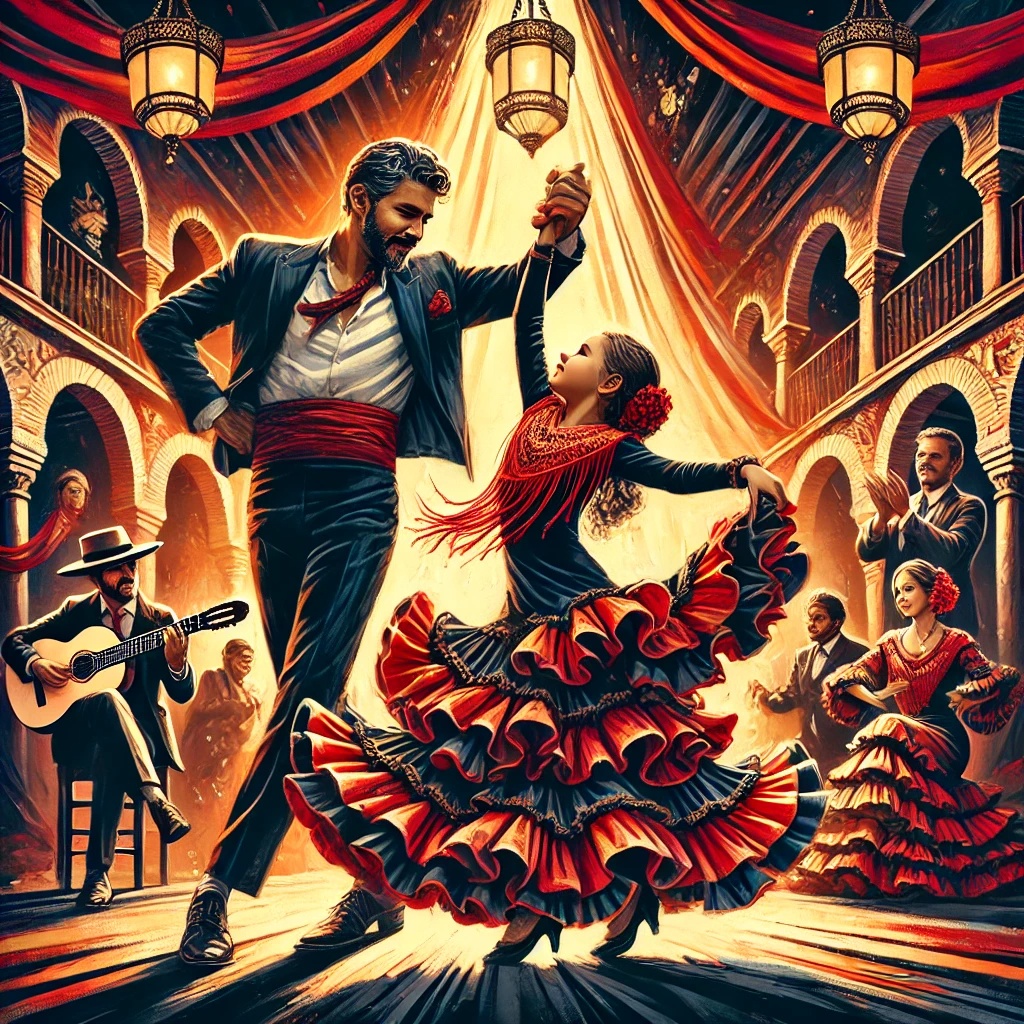 Fiery flamenco piece with rapid guitar strumming, clapping palms, and passionate vocals, A dynamic and dramatic celebration of love and resilience, infused with Spanish rhythm and flair