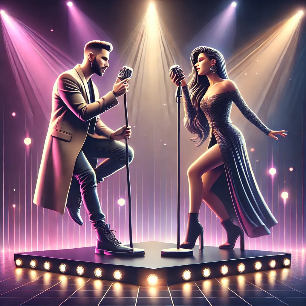 A dynamic heartfelt duet with alternating verses and harmonized choruses, modern pop powerfull blending soulful voices, tender piano, strings, and poignant lyrics, evoking resilience, electro