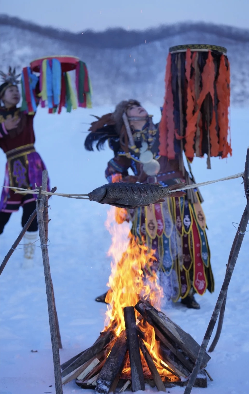 Experimental vocal music, Inuit-style Katajjaq, shamanic ritual atmosphere, ancestral and communal feeling, playful yet focused vocal interaction, vocals dominant and in the foreground, resilience and human courage in harsh environments, raw, natural, and life-affirming