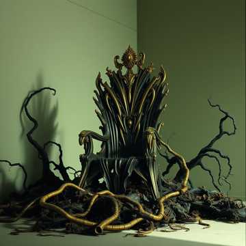 symphonic, synth, industrial metal, horror, regal, unrelenting, distorted bass, eerie choral pads, deep booms, metallic textures, warped growls, harsh male vocals, commanding, eerie backing vocals