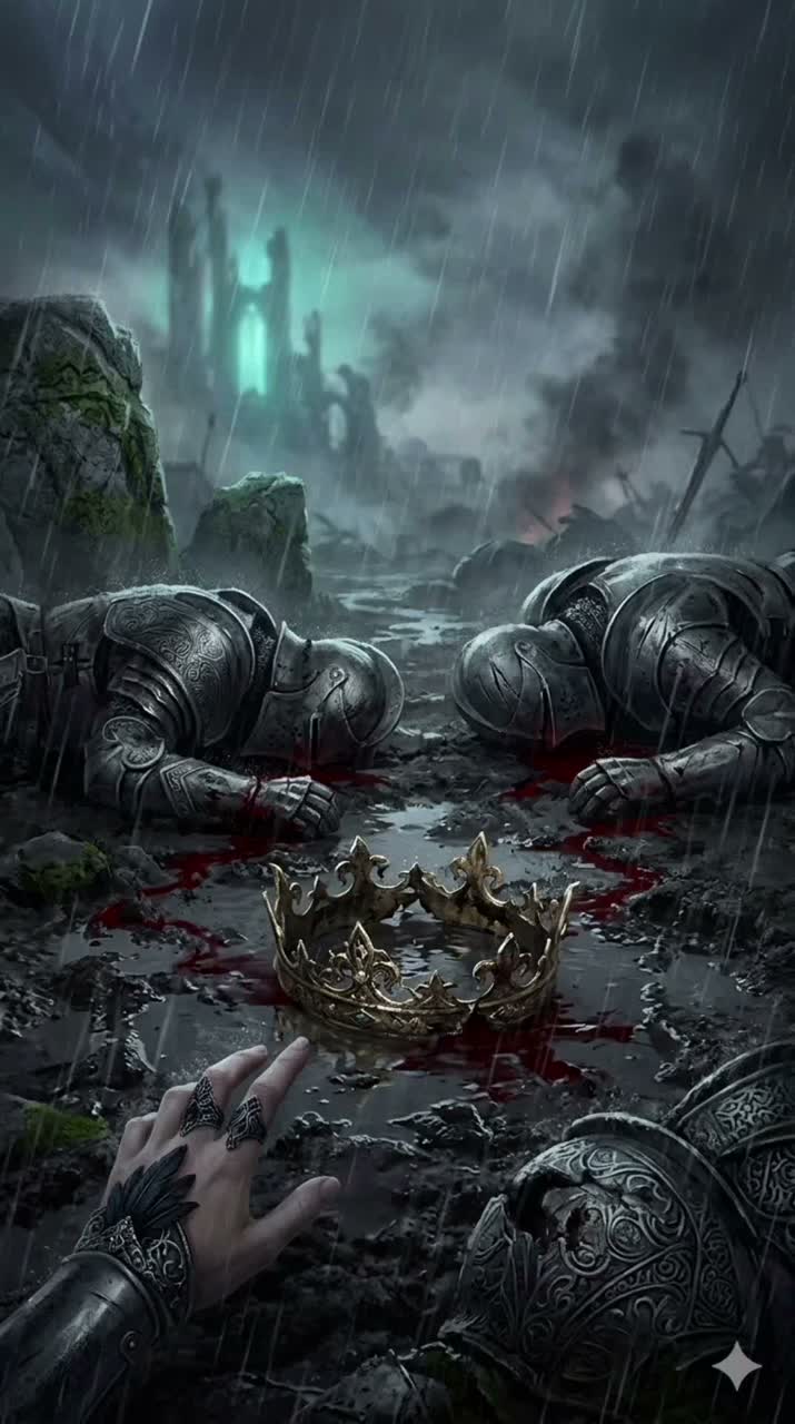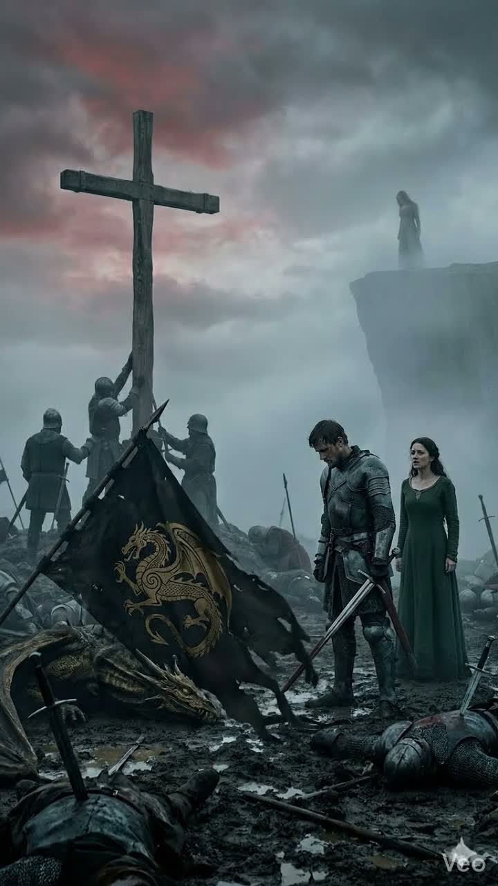 Symphonic tragic power metal, epic doom metal influences, 120 BPM, Highly emotional and cinematic theatrical atmosphere, Instrumentation features heavy drop-tuned chugging rhythm guitars, thunderous galloping double bass drums, sweeping mournful orchestral strings, and resonant tolling medieval bells, The vocal delivery is led by a soaring, powerful female voice filled with deep regret, dramatic vulnerability, and sorrowful melodic belting, Wide cinematic soundstage with massive cathedral reverb, Dynamic structure alternating between furious, fast-paced aggressive metal riffing representing the chaos of battle, and crushing, slow, doom-laden atmospheric breakdowns reflecting devastating grief and the realization of a failed master plan, Expressive weeping lead guitar solos, tragic minor-key melodies, dense wall of sound, clean and heavy modern metal production