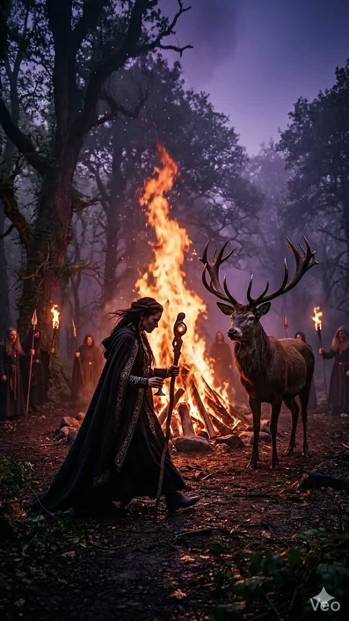 Dark pagan symphonic power metal, 140 BPM, Primal animistic ritual atmosphere, Heavy galloping drop-tuned guitar riffs mixed with ancient tribal percussion, pounding war drums, and eerie tagelharpa, Theatrical dual vocals: a commanding operatic female lead and a gritty, distressed male vocal for contrast, Hypnotic rhythmic chants, guttural backing choirs, Dynamic shifts between a slow, trance-like dark folk acoustic intro with ominous whispers, building into an explosive, aggressive heavy metal wall of sound, Dark, bloody, earthy, cinematic production, haunting melodies, tragic climax, epic storytelling, aggressive double bass drumming, immersive ritualistic soundscape