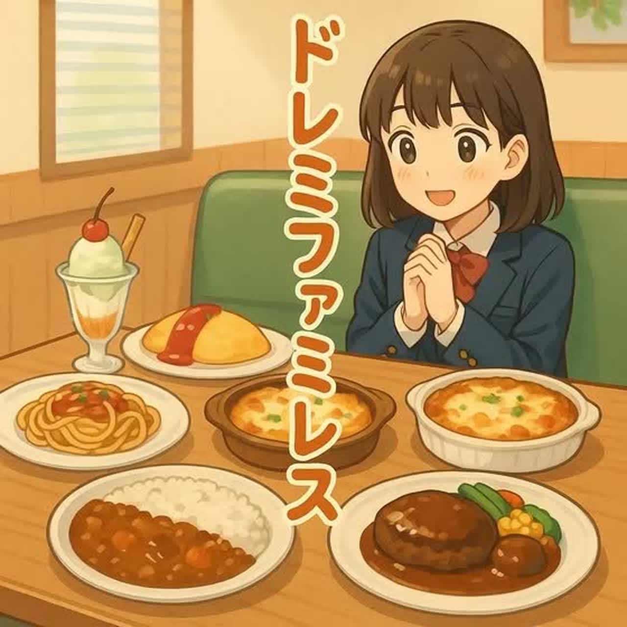128 BPM, Hybrid French Touch Filter Disco + Modern Disco House + Filter House, club-ready 4-on-the-floor, warm funky disco chord loop (sample-like), deep punchy kick + tight sub, bass: round disco + filtered saw, strong sidechain pump (heavier in drops), hats with swing + shuffled percussion, snappy claps, cut/muted funk guitar chops (mathy syncopation), slow 16-bar low-pass sweeps + filter-gate stabs, glitch盛り: micro-stutter, buffer repeat, retrigger, beat-slice fills, tape-stop/vinyl-stop accents before drops, light bitcrush (controlled), clean mix, energetic warm groove, after-school nostalgia with a bittersweet mid-section, Japanese vocal clear, add subtle spoken ad-libs, drop hook = vocal-chop loop of 『ドレミファミレス』, DJ arrangement: 32-bar intro/outro, breakdown→build→drop, big final lift then chopped outro, room/club reverb, subtle vinyl noise, bright risers, wide stereo disco strings
