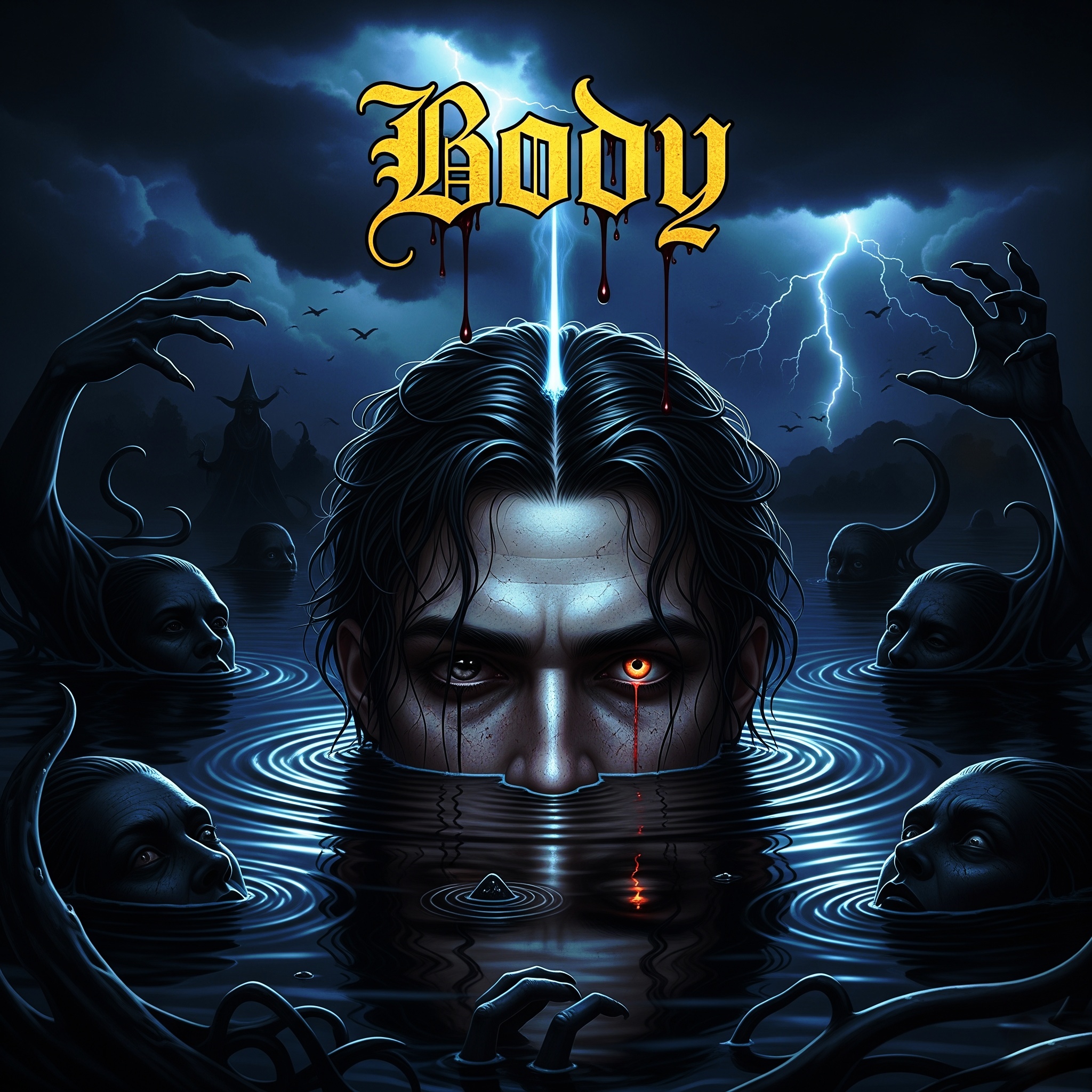 A glam-rock male vocalist, A rapturous funeral dirge steeped in death’s velvet embrace, this track channels ethereal gothic hauntings and dark psytrance perfection, A masterful fusion of genres—dark electropop, dark psytrance, ethereal gothic, modern mod, Bengali swamp blues, acid jazz, dark synthwave, electronic trap, and dubstep—intertwine to form a soundscape that is both shadowed and sublime, Layers of pulsating basslines, acidic rhythms, eerie synths, and ghostly blues textures collide in a richly atmospheric sonic ritual, At its center, a dark, gritty, operatic powerhouse vocalist commands the storm, their voice wrapped in distortion and silk, rising and falling like a mournful cathedral bell, The seductive refrain drips with venomous allure and sorrow, weaving into the instrumentals like a phantom lover, The result is complex, emotive, and theatrical—a haunting, hypnotic spell of sound that grips the soul and does not let go, Perfect for the dancefloor of the underworld