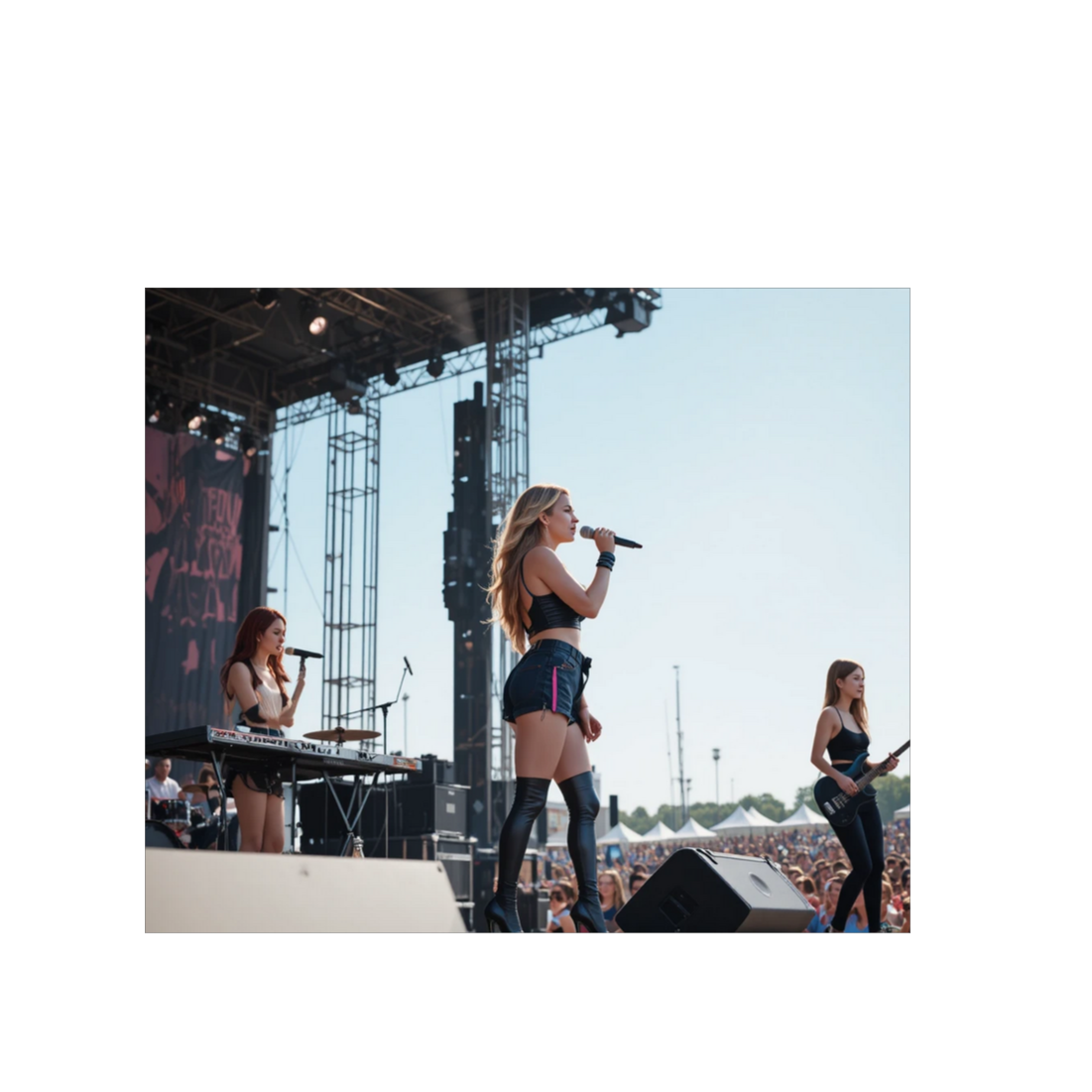 Inspired by gritty American Hair metal rock and the swagger of classic Sunset Strip bands, Start with a gritty, driving guitar riff built on power chords and slides, instantly catchy and groove-based, Tempo should be around 104β108 BPM with a bouncy, confident feel, Bass lines must be groovy and locked tightly with the guitar riff, Drums should be punchy and rhythmic, featuring deep toms and gated snare reverb, Avoid stadium scale; aim for a loud biker bar atmosphere with warm, slightly reverb room sound, Vocals should be energetic, high-attitude, and confident, full of swagger rather than emotion, Verses must bounce with groove, while choruses explode into catchy, sing-along hooks, Add a flashy 80s-style guitar solo with tasteful tapping and dive bombs, Mood: wild, dangerous, adrenaline-fueled β like a late-night rock βn roll run under neon lights, grainy female vocals, female chorus