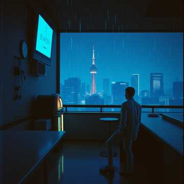 Ambient jazz, spacious reverb, delicate acoustic guitar, distant city sirens, soft melodic humming