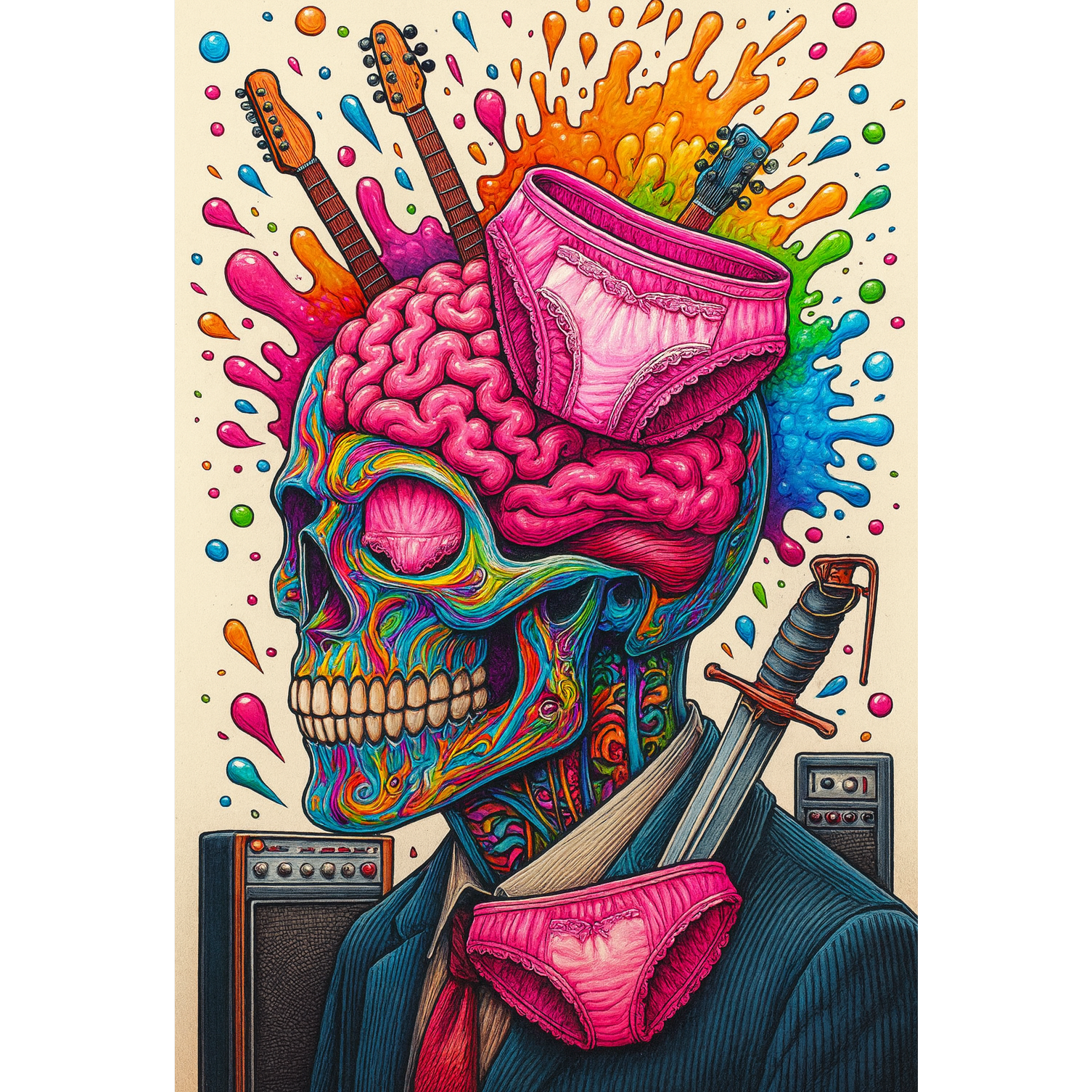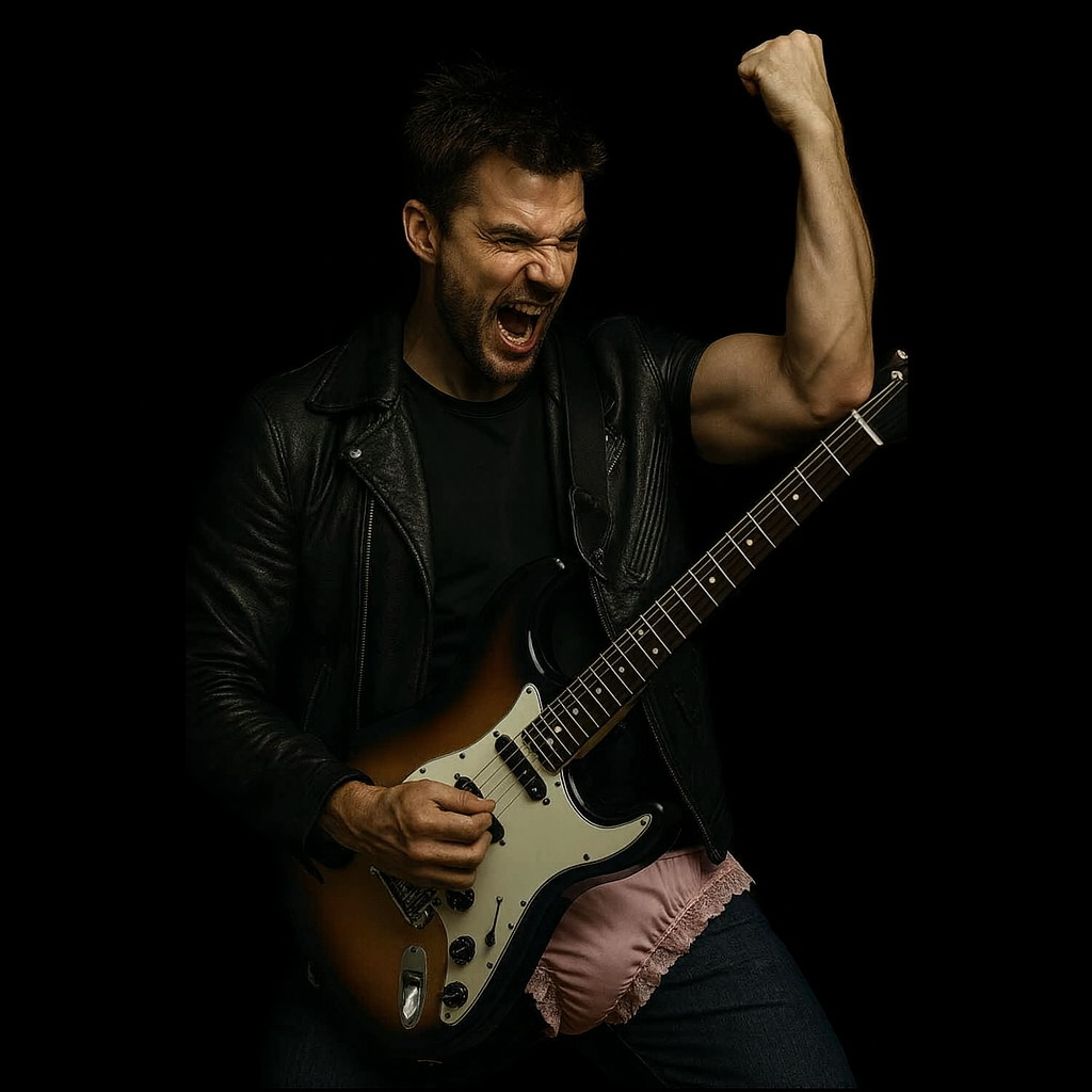 Genre: Psychedelic Punk, Glam Rock, Slacker punk rock, garage rock, Grunge, Style: RHYTHM GUITAR (Vocalist): Distorted electric guitars (fuzzy/crunchy, Fuzz/Big Muff distortion), "ACOUSTIC SLAP/CHOPPER TECHNIQUE (UNRELENTING FAST STRUMMING, TIGHT PALM MUTING)", LEAD GUITAR: (wild solos, layered textures), Walking wood bass, DRUMS: Layered Vintage Rock Kit + 808 Drum Machine (snappy snare/heavy kick/tom fill), Emotional power chords, SHARP FUNK GUITAR, LOW END MAXED, FX: Heavy Sludge Reverb, Noise Gate, Psychedelic Noise Filter, Digital Decay, Vocal: FEMALE (Rhythm Guitarist), VERY HARD raspy/husky, voice must crack, PERFECT PITCH, scream half a word then whisper it, chant hooks sound like "BUZZING, CRUDE SHOUTS" + "COUNTRY RASP", ULTIMATE INTENSITY, Restrictions: MONO VOCAL FORCE ONLY, ABANDON ALL VOCAL FILLERS, NO BACKING VOCALS, NO POP-LIKE VOCAL ENDINGS, ABANDON ALL VOCAL FILLERS: