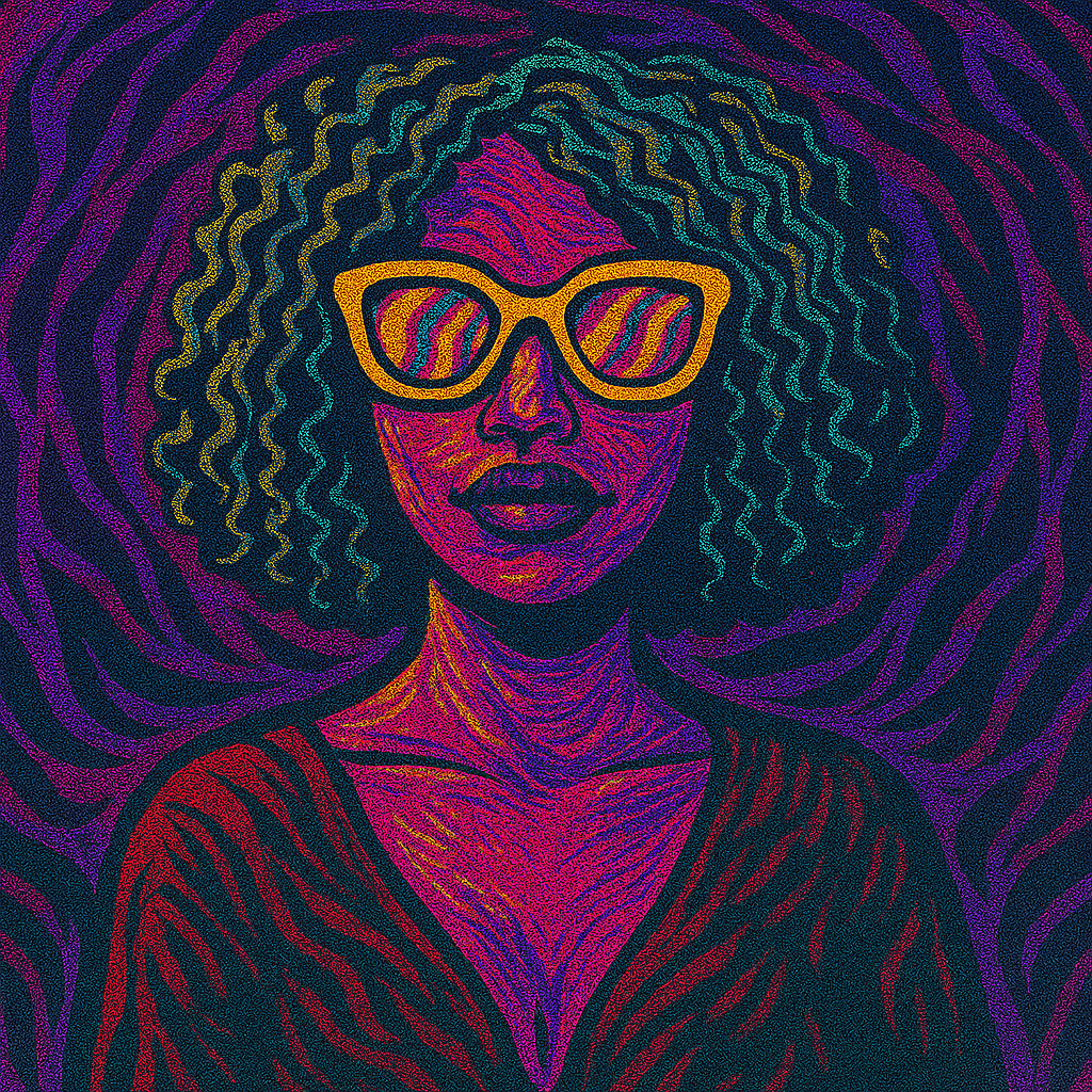 Shimmering fuzz guitars drenched in violet haze, slithering with hypnotic phaser shadows, Glam stomp drums echo like a forbidden ritual, while a pulsing bassline ferments beneath, warm and wicked as intoxicating night steam, Neon-flicker synth shards twist like serpents, tangled with fog-textures, reverse whispers, and warped tape spirals, Glitter hits glimmer like cursed gemstones, Vocals blend a whispery, seductive female vocaloid with occult glam chants, metallic breaths, granular murmurs, and bitcrushed sighs, The atmosphere is elegantly unholy—colors bleeding, blooming, and collapsing in slow motion like forbidden chemistry, Every motion is ruled by the law of “F”: Flicker, Fermentation, Friend, Future—an alluring psychedelic glam invocation dedicated to the Flow Work universe