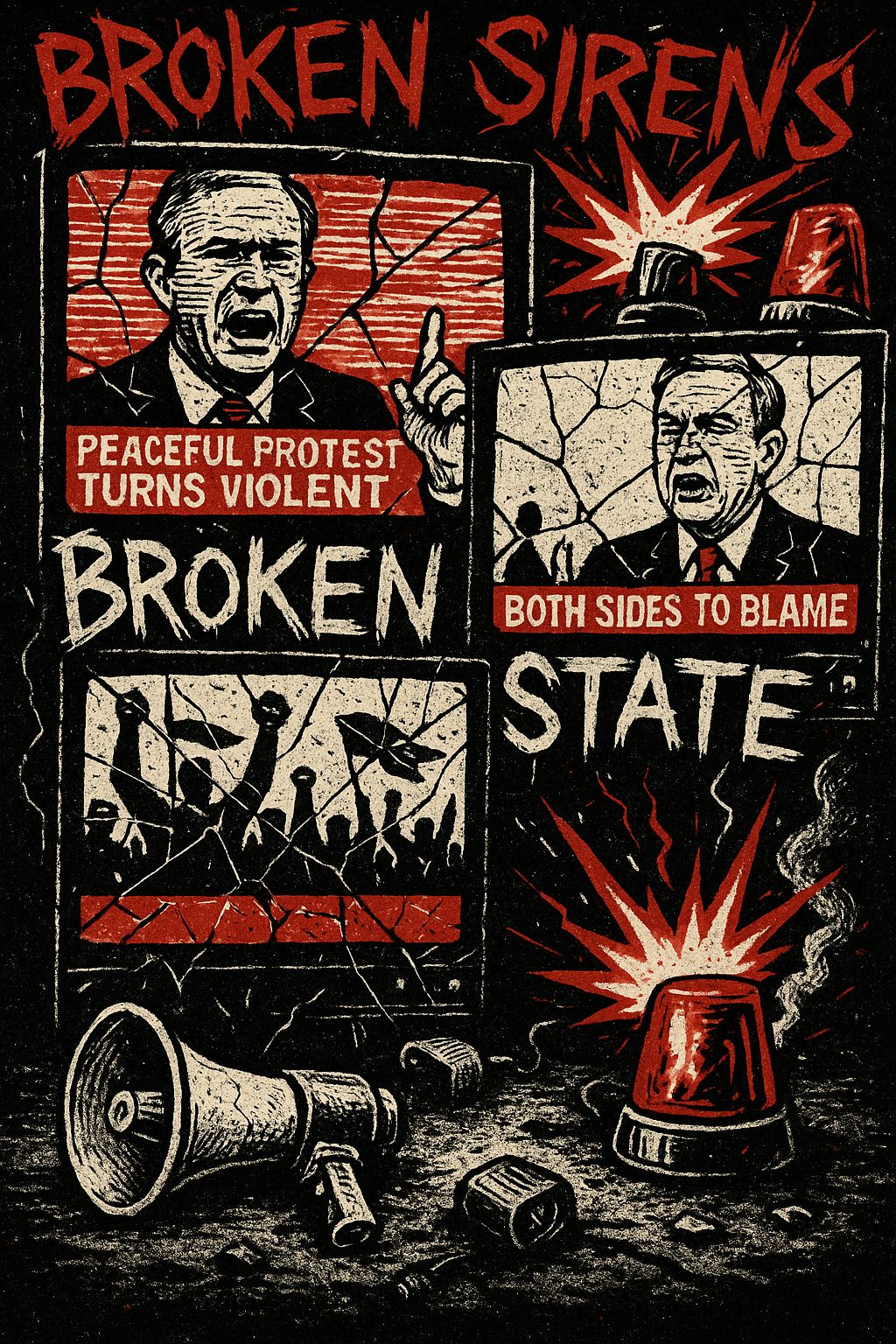 A furious alt-punk/political punk anthem dripping with sarcasm and rage, Tempo 185–200 BPM with jagged distorted guitars, gritty bass, and relentless snare-heavy drums, Verses delivered in sneering, rapid-fire male vocals mocking fragile politicians, hollow slogans, and collapsing authority, Pre-choruses use varied call-and-response chants that escalate recognition of the broken state, Choruses erupt into gang vocals shouting “BROKEN SIRENS, BROKEN STATE!” with venomous defiance, including final variations like “WE DON’T RUN, WE INCINERATE!” Spoken-word interludes parody media spin and press conferences, satirizing blame-shifting, false flags, and both-sides excuses, Bridge snarls with scathing sarcasm, dripping disgust at “law and order” lies, Outro layers a panicked broadcast voice scrambling to misdirect, overwhelmed by furious gang chants, Mood: venomous, mocking, anarchic — pure protest punk broadcast chaos