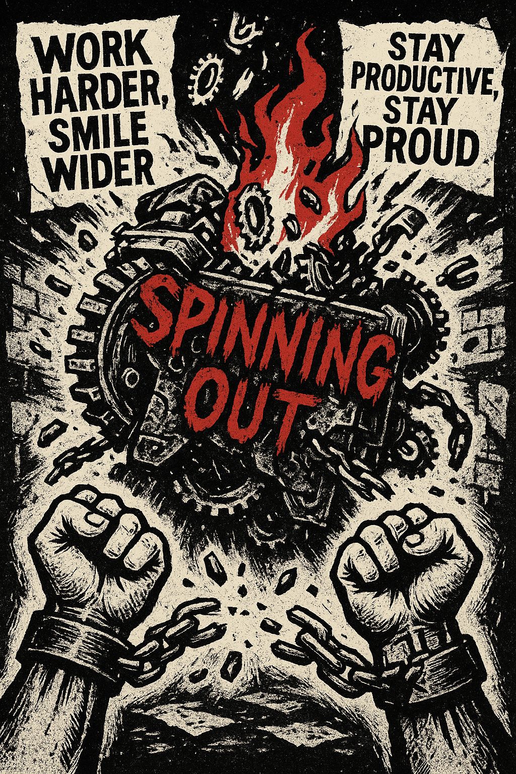 A furious alt-punk/political punk anthem with chaotic protest energy, tempo 170–190 BPM, Driven by distorted power chords, gritty bass, and relentless drums that feel like a machine grinding apart, Verses delivered in sneering, rapid-fire male vocals dripping with sarcasm, mocking workplace culture, management slogans, and systemic collapse, Pre-choruses use call-and-response chants, Choruses erupt into fists-up gang vocals shouting “Spinning out! Breaking down!” with raw fury, Bridge and hook sections become chaotic gang chants about crushing gears and breaking chains, Outro layers bitter spoken sarcasm — fake slogans like “Work harder, smile wider” — with shouted chants fading into distortion, Mood: explosive, mocking, and defiant — pure rage against the machine