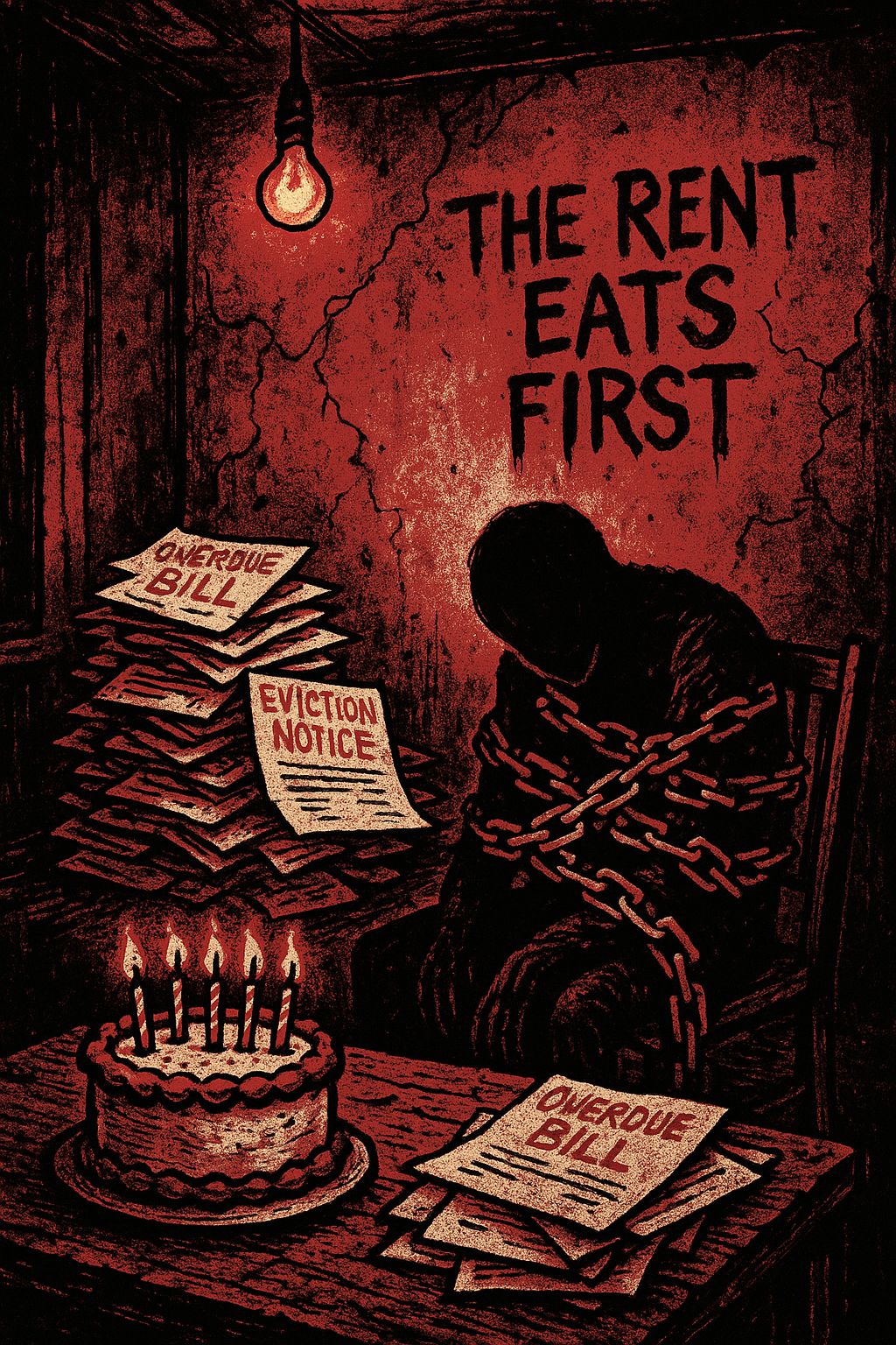 A raw, political-leaning alt-punk track with satirical bite and protest energy, Driving distorted guitars, aggressive bass lines, and fast-paced drums set a tempo around 170–190 BPM, Vocals alternate between sarcastic, rapid-fire male verses and shouted gang vocals, Pre-choruses use call-and-response to highlight collective frustration, Choruses are anthemic, chant-like, built for audience shout-alongs, Bridge erupts into chaotic shouting, while the hook becomes a fists-up gang chant of “The rent eats first!” Intro features spoken/shouted manifesto lines over guitar feedback, and the outro expands into shouted protest verses with a sarcastic spoken fade-out, Mood: biting, furious, socially conscious, channeling Bad Religion, NOFX, and Dead Kennedys—angry, sarcastic, and unforgettable