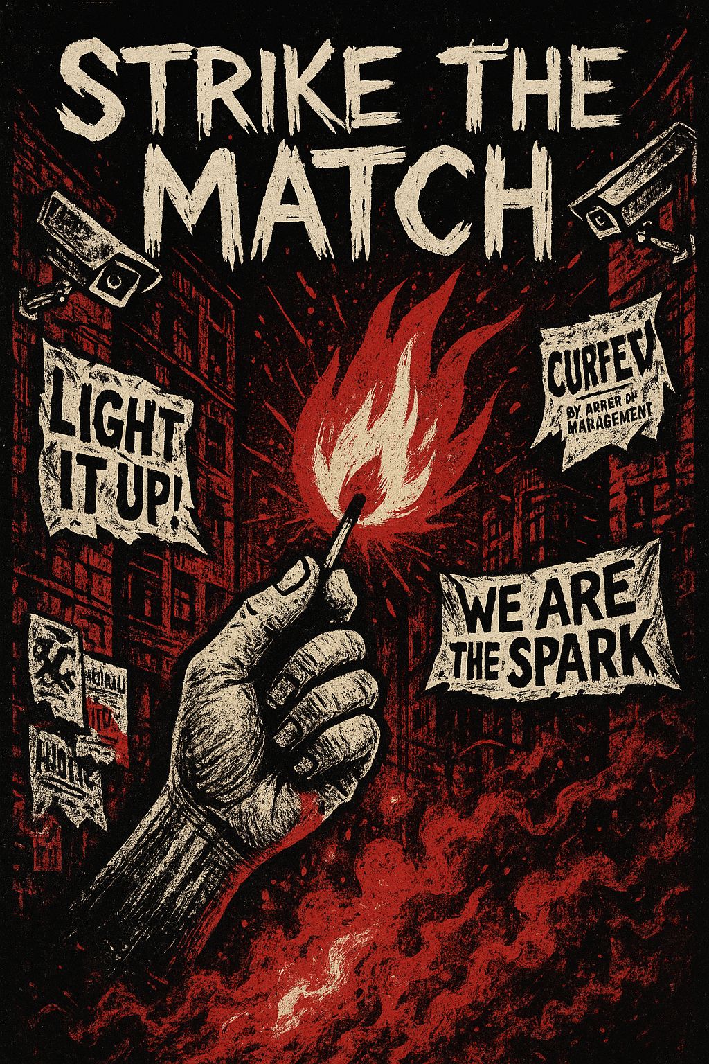 A venomous alt-punk/political punk anthem delivered with sarcasm sharp as a whip and unrelenting animosity, Tempo 180–195 BPM with jagged distorted guitars, snarling bass, and pounding snare-driven drums, Verses spit venom in sneering male vocals, mocking curfews, cameras, and authority with caustic wit, Pre-choruses use shouted call-and-response countdowns, Choruses explode into gang vocals screaming “STRIKE THE MATCH! LIGHT IT UP!” with raw, furious defiance, Bridge snarls with mocking chants of “If they build the night, we’ll torch the night!” dripping with spite, Hook layers shouted chants with a sneered spoken taunt, intensifying the sarcasm, Outro collapses into a panicked broadcast voice glitched under furious chants, ending with whispered venom, Mood: caustic, rebellious, sarcastic, and dangerously infectious — a sneer turned into a riot anthem