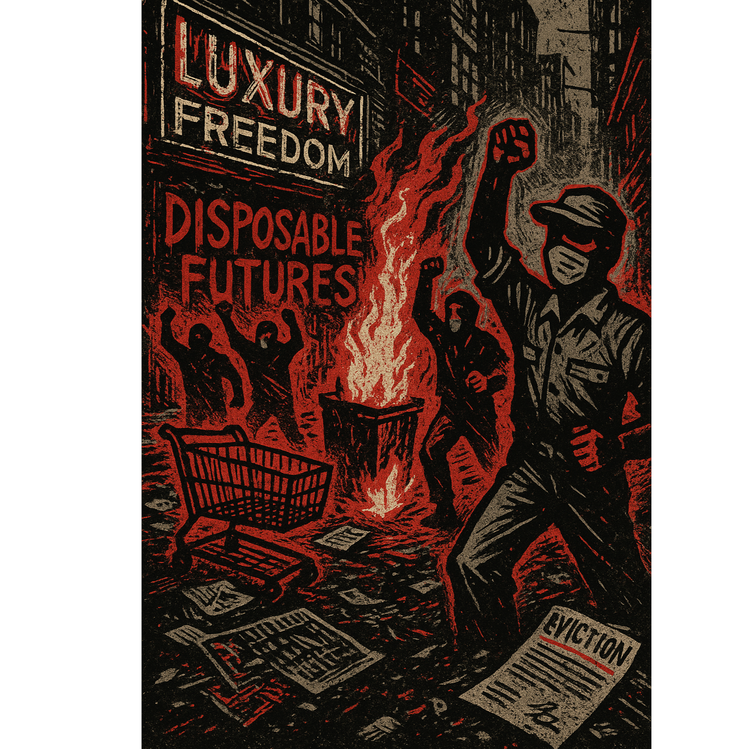 A furious alt-punk/political punk protest anthem, fast tempo 170–190 BPM with distorted power chords, gritty bass, and relentless drums, Verses delivered in rapid, sarcastic male vocals targeting late-stage capitalism, corporate greed, landlords, and politicians, Pre-choruses use call-and-response chants, Choruses erupt into fists-up gang vocals shouting “Disposable! Replaceable!” Bridge turns chaotic with shouted slogans about consumerism and collapse, leading to a hook of repeated chants, Outro layers sarcastic spoken lines with furious chants fading into distortion, Mood: biting, angry, and defiant, blending the speed of skate punk, the grit of street punk, and the sharp, politically charged energy of classic protest punk