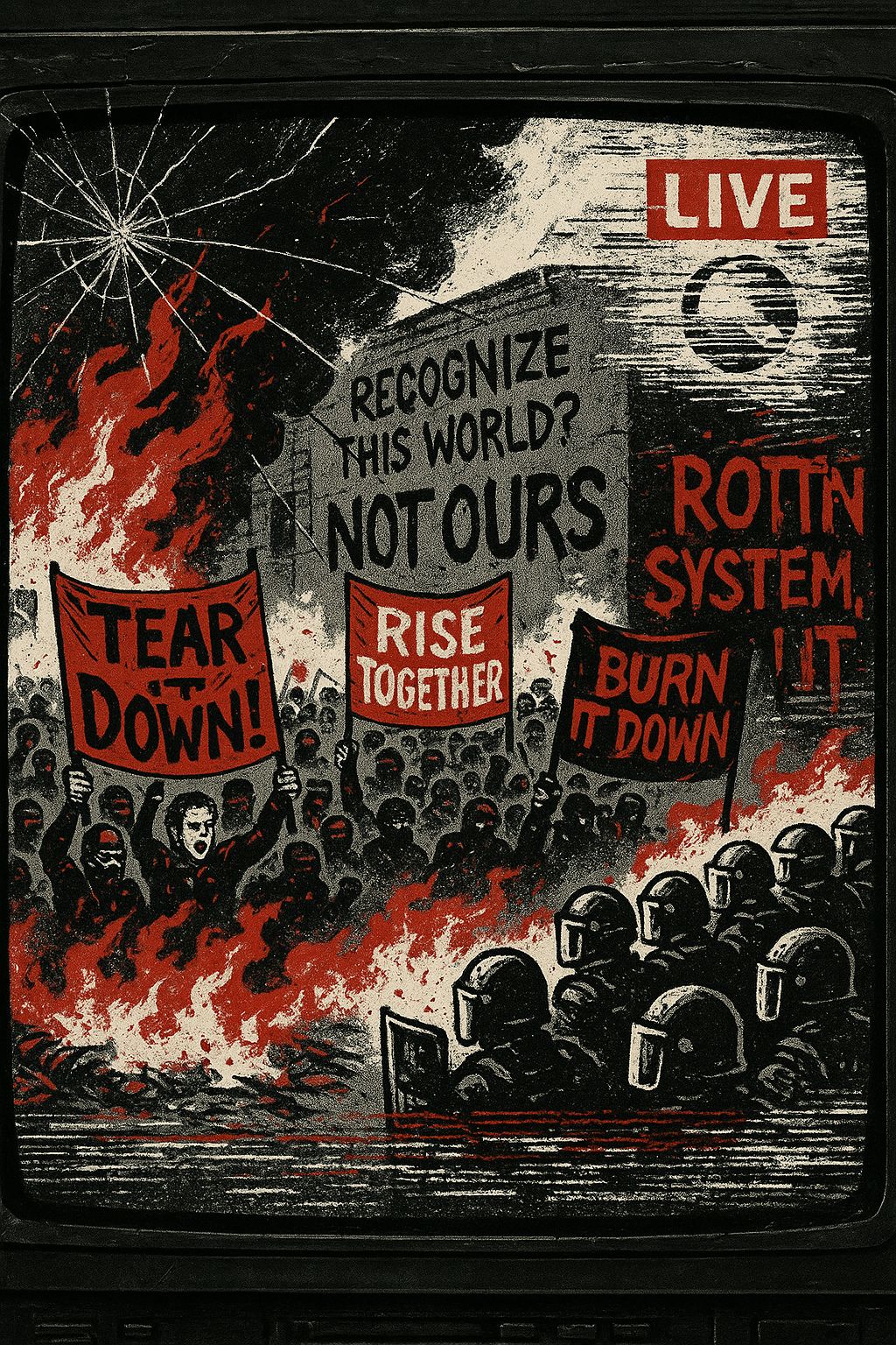 A furious alt-punk/political punk anthem styled as a hijacked live broadcast of revolution-in-progress, Tempo 180–200 BPM with distorted guitars, driving bass, and relentless drums, Verses delivered in sneering, rapid-fire male vocals like a breaking news report from burning streets, describing riots, collapsing authority, and stolen feeds, Pre-choruses use call-and-response chants, Choruses explode into fists-up gang vocals shouting “Recognize this world? Not me!” dripping with defiance, Bridge becomes a chaotic chant of “Tear it down!” shouted like a rally in progress, Intro and outro layer and overlap the sarcastic broadcast lines with gang chant anthems, creating the feel of propaganda collapsing under protest, Mood: urgent, venomous, anarchic — raw punk energy with broadcast chaos