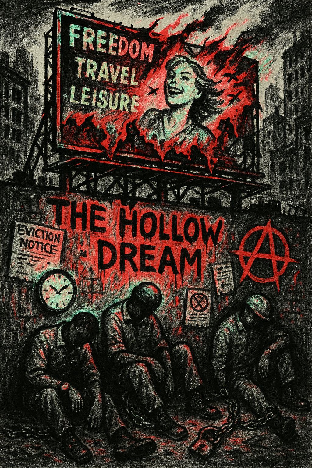 A fast-paced alt-punk/political punk track with raw protest energy, Tempo 170–190 BPM, built on distorted power chords, gritty bass, and pounding drums, Vocals alternate between sarcastic spoken intros, rapid-fire shouted verses, and gang-vocal chants, Pre-choruses use call-and-response to highlight systemic betrayal, Choruses are anthemic and slogan-like, designed for audience shout-alongs, Bridge erupts into chaotic shouting, followed by a fists-up gang chant of “The hollow dream!” Outro layers bitter spoken lines with furious shouts, ending in defiant chants and distorted whispers, Mood: biting satire, collective outrage, and fragile hope, channeling Bad Religion, NOFX, and Dead Kennedys
