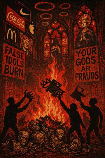 A furious alt-punk/political punk anthem, a bonfire against wealth-worship and false sainthood, Tempo 180–190 BPM with distorted guitars, grinding bass, and relentless snare-driven drums, Intro opens with a hollow spoken-word sermon in monotone preacher cadence, cut apart by shouted gang chants of “FALSE IDOLS BURN!” Verses delivered with sneering male vocals spitting venom at politicians, celebrities, and millionaires raised as prophets, Pre-choruses use sharp call-and-response chants mocking shrines, pulpits, and crowns, Choruses explode into fists-up gang vocals screaming “FALSE IDOLS BURN! NO SAINTS OF STATE!” with venom, including variation “NO GODS OF GOLD, JUST BONES IN THE FLAMES!” Bridge snarls with sarcasm, parodying church and state commands before tearing them apart, Outro collapses into static as the sermon voice crumbles, drowned by chants roaring “YOUR GODS ARE FRAUDS! WE SPIT THEM OUT!” Mood: venomous, blasphemous, defiant — a punk ritual of burning false gods