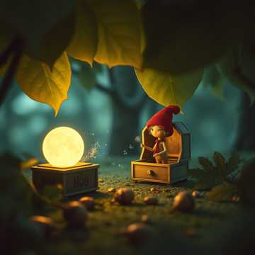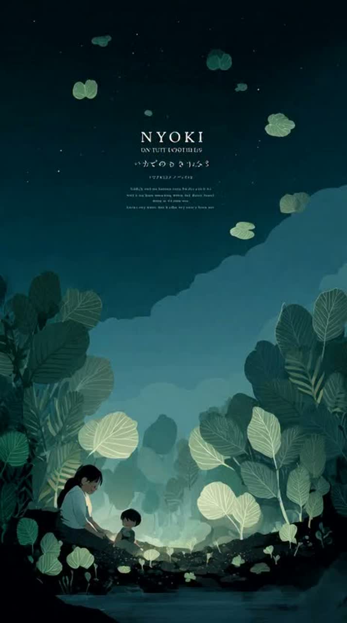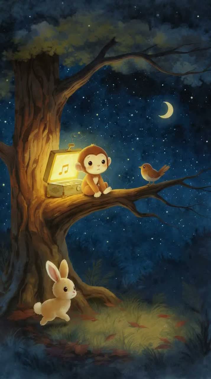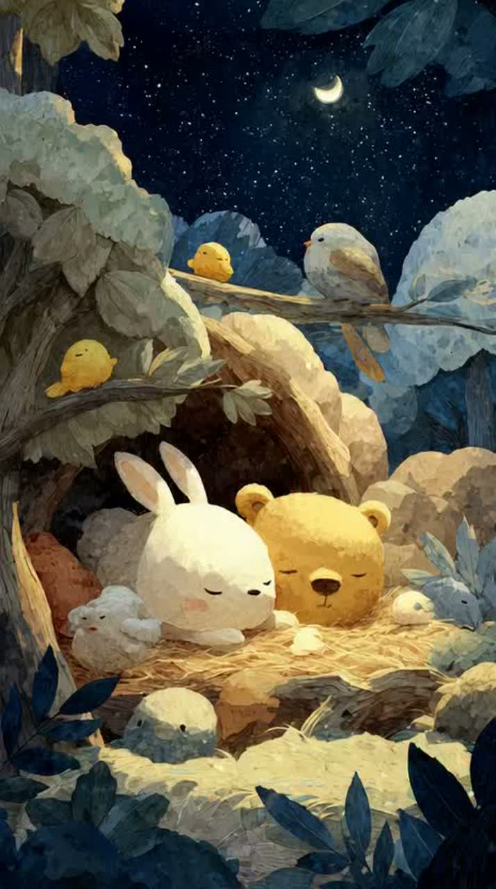 Gentle Japanese female voice, Maternal narration, Soft whispers, Lullaby rhythm, Spoken word, Music box, ASMR, High fidelity, Warm and cozy, Midnight forest ambience