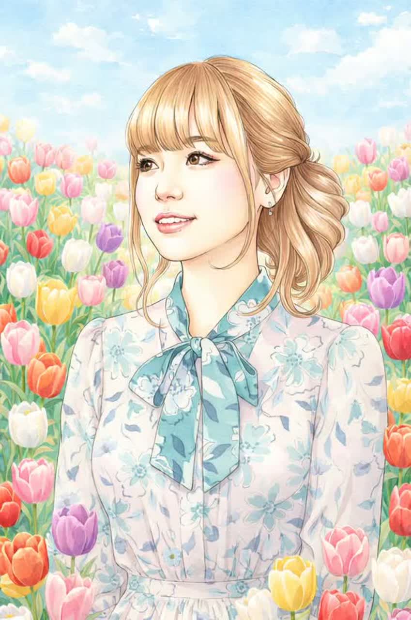 Breakbeat, Synth-pop, Upbeat, Sweet, Sparkling, a clean kawaii female vocal like **ano's sttyle**, Catchy song melody, Performance with synth, Tabla, glockenspiel, xylophone, marimba, and TR-808, Twin TR-808 kits, one TR-808 lays down a solid beat throughout the entire track, another TR-808 lays down breakbeat rhythms, Tabla-driven rhythmic compositions, featuring hypnotic hand-played tabla and TR-808 patterns as the primary groove, glockenspiel, xylophone and marimba repeat catchy and rhythmic loops, These three instruments form polyrhythms, building momentum for the breakbeat, The synthesizer plays a catchy solo phrase during the intro and interlude, its tone reminiscent of the Prophet 5 style, The motif: Tulips are the perfect flowers to express new beginnings and a positive outloo