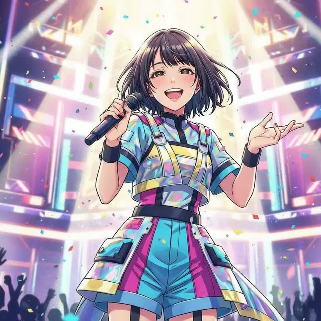 A high-energy, upbeat idol pop song with a bright and lively feel, The music features a driving drum beat with a pop-punk tempo and a powerful, energetic bassline reminiscent of a Rickenbacker, The lead instrument is a clean electric guitar playing catchy, melodic riffs and upbeat power chords, A subtle, bright synthesizer adds a layer of sparkle and atmosphere, enhancing the cheerful mood, The vocals are performed by a group of five female singers, with a cheerful, energetic, and slightly innocent tone, focusing on harmonies and call-and-response parts, The overall mood is uplifting and future-focused, creating a feeling of hope and emotional resonance, perfect for a modern idol group, The song starts with a brief, powerful instrumental intro before the vocals begin,