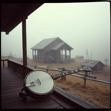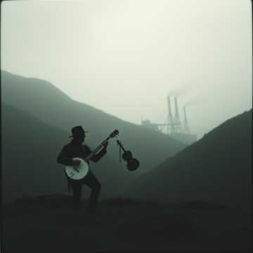 a sparse arrangement: mournful fiddle weaves around \ banjo, reverb-heavy acoustic guitar adds eerie layers, Sparse percussion punctuates a foundation of minor chords, Ambient scene, as if playing on a mountainside around coal mines, haunting harmonies on the chorus, delivered with a chilling echo, driving home the song’s desolate, haunting presence, ‑blues