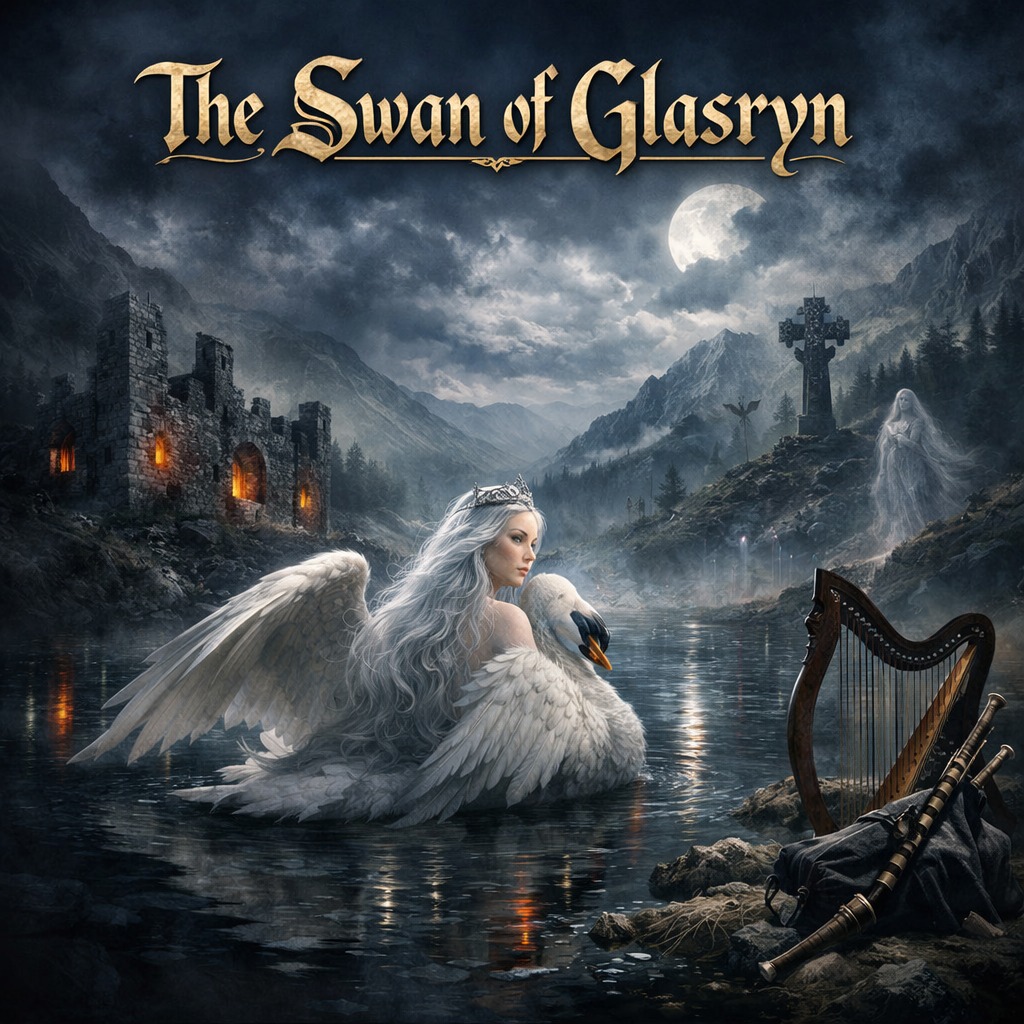 Welsh Melodic Gothic Metal with Dark Gothic Hard Rock, Dark, romantic, atmospheric studio production — Guitar-driven with powerful melodic hooks, Welsh-tone operatic female lead (Katherine Jenkins energy), layered backing vocal harmonies only (no choir), Distorted gothic rhythm guitars, expressive lead guitar, deep bass, tight live drums, subtle atmospheric strings, cathedral organ textures, dark ambient synth pads, Celtic harp, crwth, and uilleann pipes featured in intro, bridge, and outro, Lyrics tell the legend of Grassi of Ffynnon Grassi, whose overflowing well formed Llyn Glaslyn; cursed to wander Cae’r Ladi or live as a swan haunting the lake, Perform ALL lyrics fully including spoken bilingual intro and outro, Do not shorten verses, Maintain full song structure and pacing