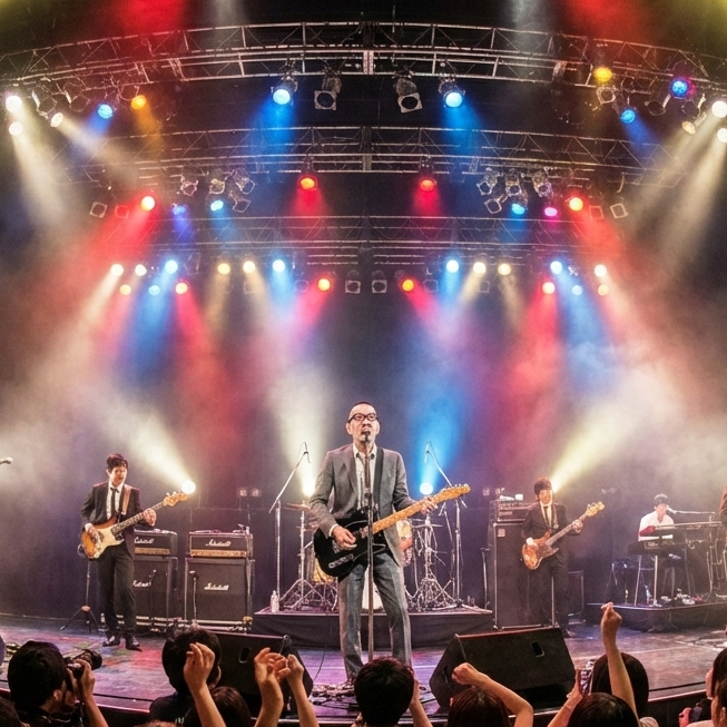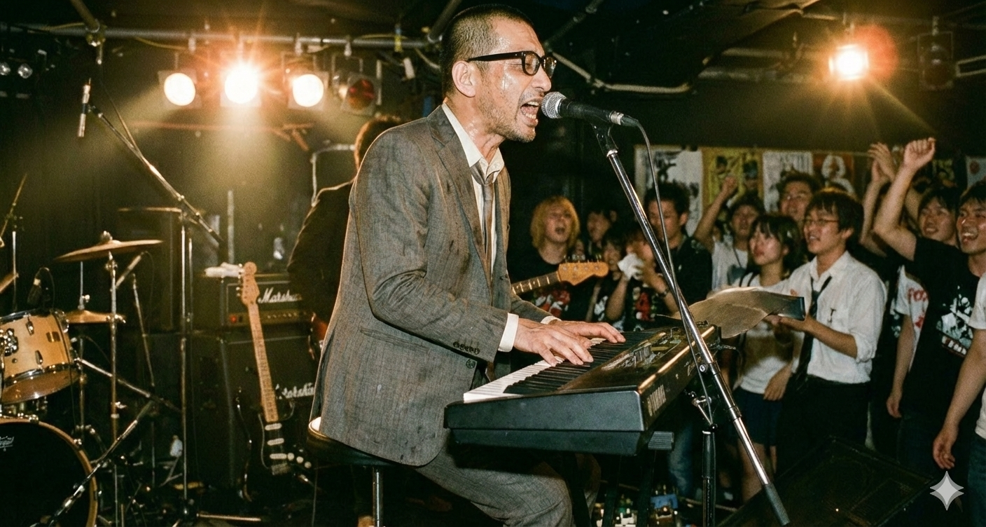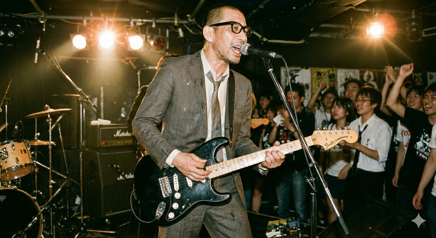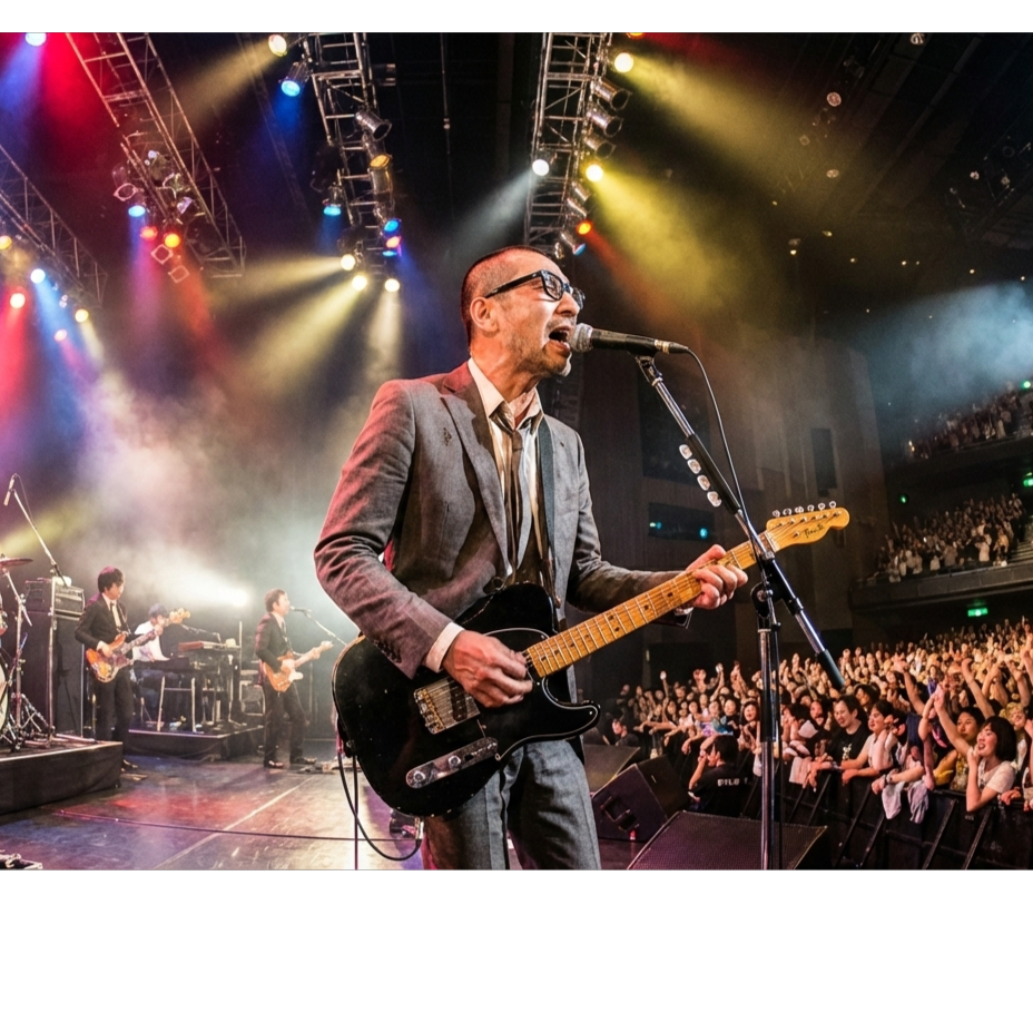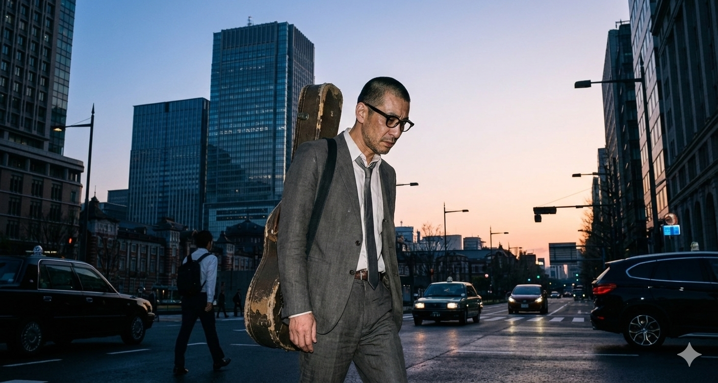 Japanese emotional rock ballad with heavy drum backbeat, electric guitar downpicking, atmospheric synth pads, solid bass lines, BPM=100, 90s J-Rock arena vibe, Vocal: male husky and gritty low-mid voice, spoken-sung phrasing, restrained emotion with inner heat, slight breath noise, occasional shouting accents, Performance feels like a lone rocker on a live stage, Arrangement balanced between guitar and synth, piano optional for tension, Minimal studio shine, slightly raw texture, subtle room reverb, Artist persona: Narita Shinnnojo, daytime salaryman / nighttime lonely rocker, sings in suit with black-rim glasses, age 47, stoic presence