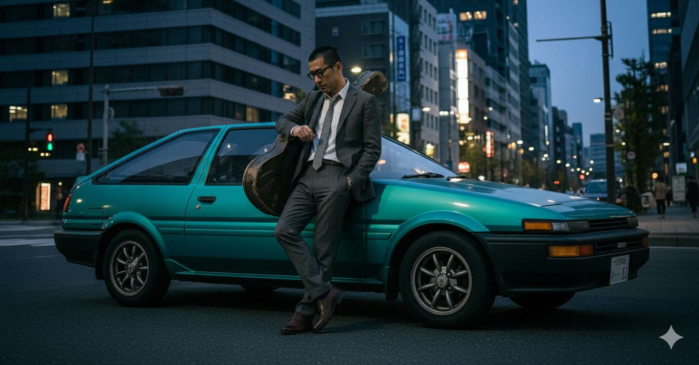 Japanese rock ballad, BPM 72, male rock vocal, low to mid-range husky voice, spoken-sung emotional delivery, electric guitar, bass, drums, piano, saxophone, slow build-up, bluesy guitar solo, soulful saxophone lines, rainy night atmosphere, nostalgic and bittersweet, live house rock, mature and heartfelt