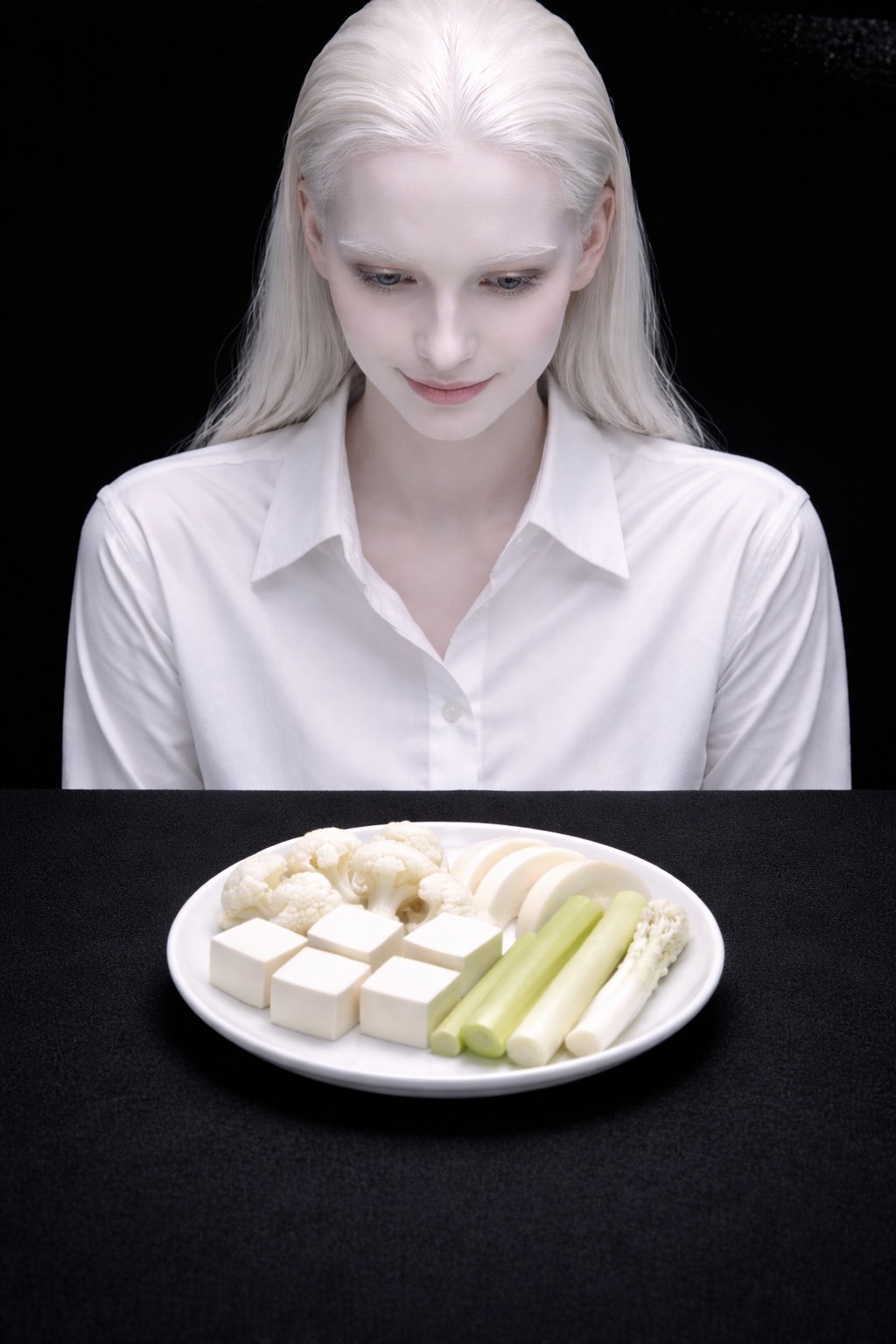 Dark ethereal art-pop / experimental darkwave with minimalist electronic production, Tempo ~70–80 BPM, Key: minor, Atmosphere: sterile, clinical, unsettling purity with an undercurrent of obsession, Female or androgynous vocal, initially clean and controlled, gradually fragmenting with subtle stutters, glitches, and breath artifacts, Instrumentation: soft shimmering pads, distant glassy synths, muted sub-bass, sparse percussion (heartbeat-like kicks, faint metallic ticks), later introducing distorted textures, granular noise, and glitch artifacts, No warmth—everything feels filtered, cold, and “sanitized, ”