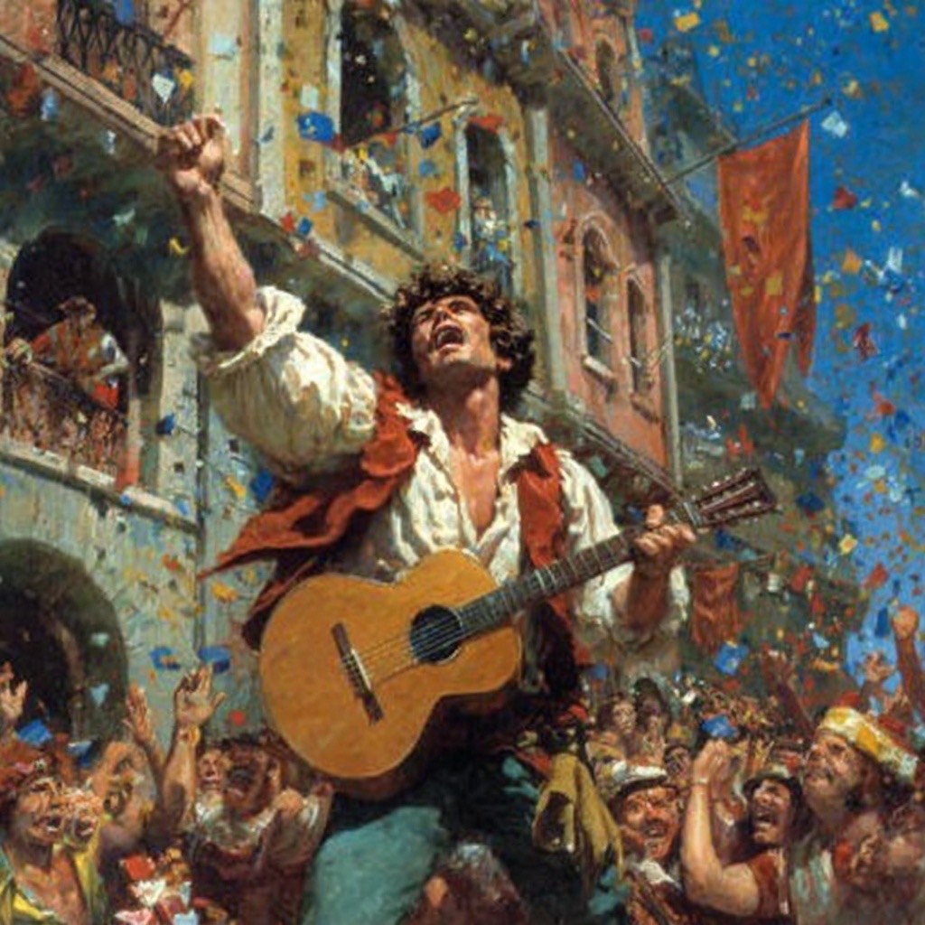 Male folk vocals, Live performance, Call and response with audience in chorus, Upbeat, fun, Rousing, Hard-driving Acoustic psychedelic rock folk song with Celtic and Turkish roots, Danceable, Built from voice, hand percussion, foot stomps, acoustic guitar, fiddle, harp, and low drone pipes or strings, Kettle drums, Melodic and modal, easy to remember and sing communally, Earthy, resilient, celebratory without drama, shaped by motion, memory, and shared rhythm