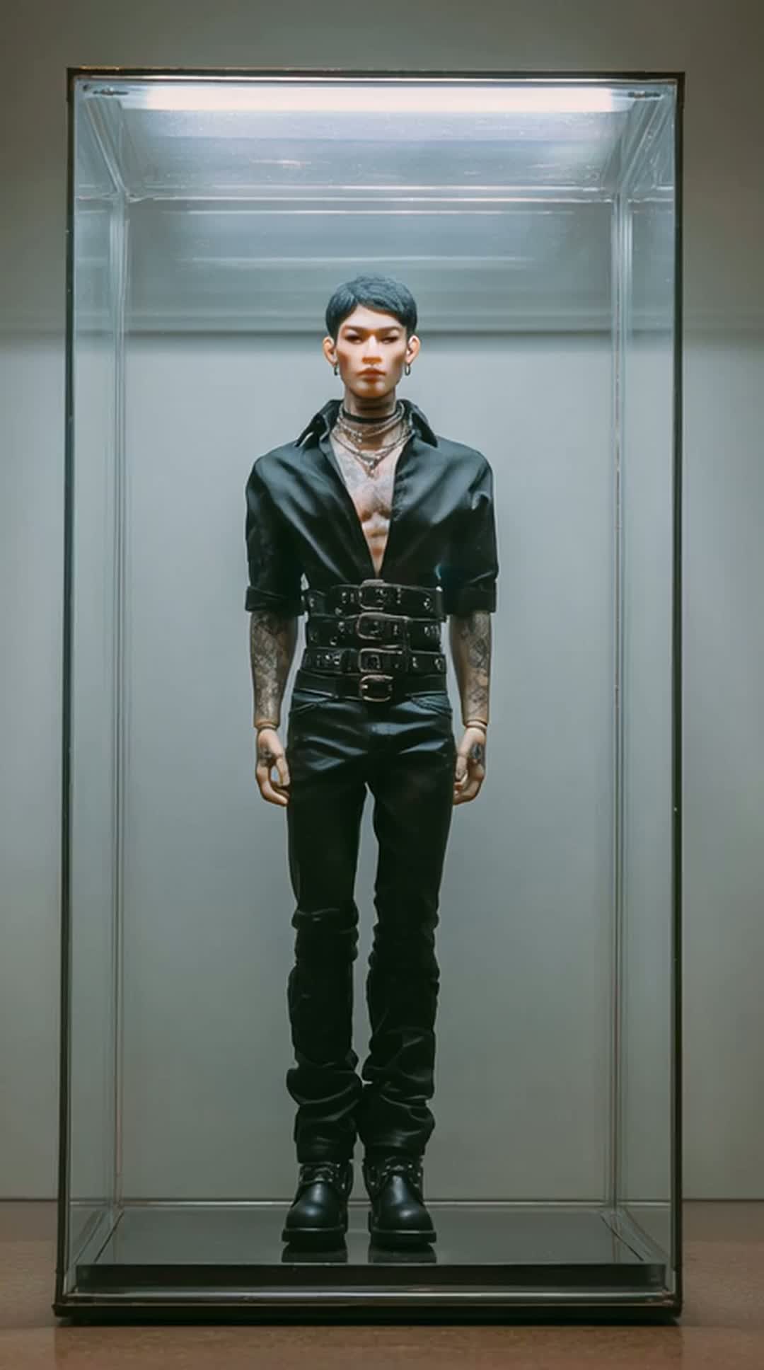 Genre: dark K-pop with trap elements, sexy Fashion runway strut, Up-tempo, Addictive Hook, Style: Club-ready, groove-driven structure with chant hooks and syncopated verses, 8-bar instrumental break features vocal chops and slap bass hits, Mood: Icy, flirty confidence with subversive swagger, Singer’s Voice: Male vocalists with cold lazy delivery, Tight chant phrasing and rhythmic pop flow, Exagerated vowels, Falsetto "eee"