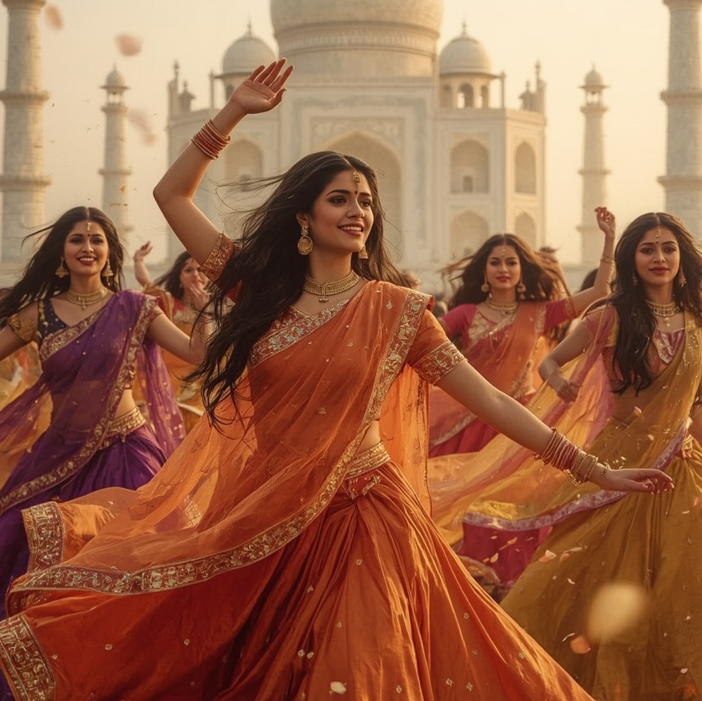 A rhythm-driven Bollywood Dance Pop fusion with Bhangra and classical Indian dance influences, Male-female duet vocals, expressive, playful, romantic, and dramatic, Energetic dhols, tablas, manjira, layered handclaps, and wooden stick taps driving the groove, Add sitar, bansuri, sarangi, harmonium, and soft temple bells for emotional and spiritual depth, Blend Kathak and Bharatanatyam percussion patterns with funky basslines, EDM beats, and cinematic strings, The mood is joyful, radiant, devotional, and vibrant, The chorus must be in Hindi, uplifting and celebratory, invoking love, moonlight, and divine connection, The verses are in English, romantic and poetic, describing dancing together in a moonlit palace at midnight, Vocals should be bright, warm, and full of smiling energy, with playful taans and alaaps