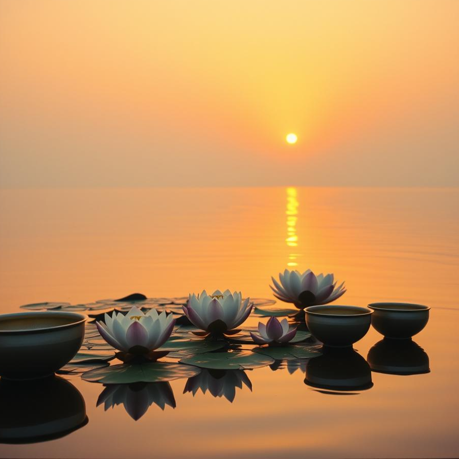 mystical, ceremonial downtempo track with layered textures: soft tabla and dholak rhythms, sitar plucks with subtle delay, ethereal sarod and esraj melodies, airy bansuri flourishes, delicate guzheng or kalimba accents, layered female vocal harmonies, whispered chants and Aum tones, resonant Tibetan bowls and gongs, ambient water sounds and birdsong, deep cinematic pads and heroic choir layers, soft wind and floating particles, warm golden and deep blue tonal atmosphere, immersive, psychedelic, chill, meditative, uplifting, rich in harmonic layers, dynamic yet subtle, evolving textures that create a trance-like, ritualistic, ceremonial mood