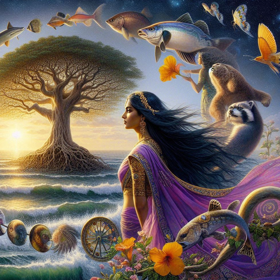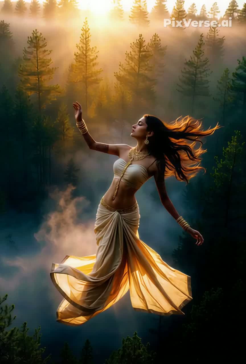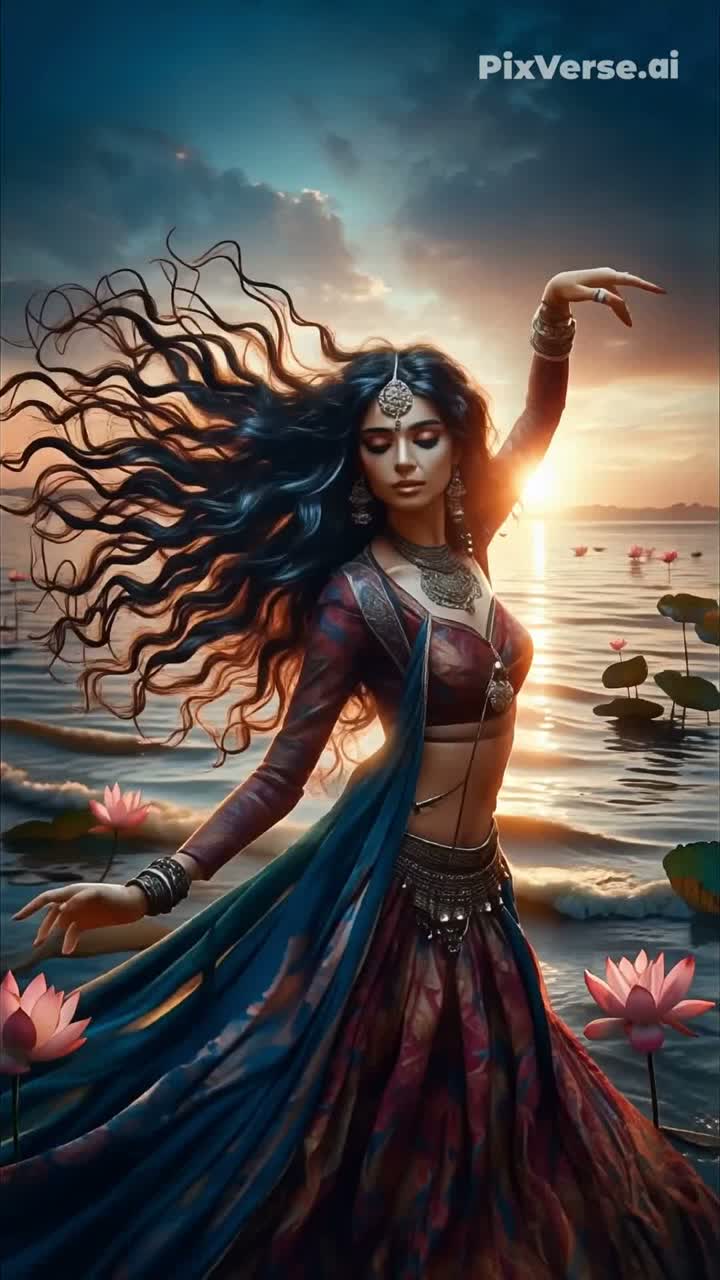 Mystical, sacred downtempo psybient soundscape set in ancient Indian temple and riverside at dawn transitioning to sunset, Ambient birdsong echoes through stone halls and along the riverbank, merging with the resonance of sitar, slow tabla, soft bells, gentle water, and distant wind, The mood is earthy, celestial, introspective, radiant, joyful, and luminous, filled with smoke, ancient carvings, first light, and the glow of sunset, Vocals are a deep, raspy, low-pitched Indian female voice, soft yet commanding, singing like a prophet who embraces impermanence with fierce serenity, Multi-voice choruses join at key moments, layered organically, evoking pure joy and transcendence, as if dancing by a river at sunset, Organic, non-electronic instrumentation includes duduk, wooden frame drums, hand percussion, soft bells, breathing textures, virtuosic solos, Overall atmosphere is timeless, sacred, alive, radiant, celebratory, deeply moving, blending introspection with ecstatic communal joy