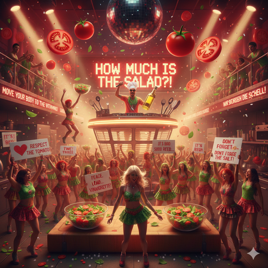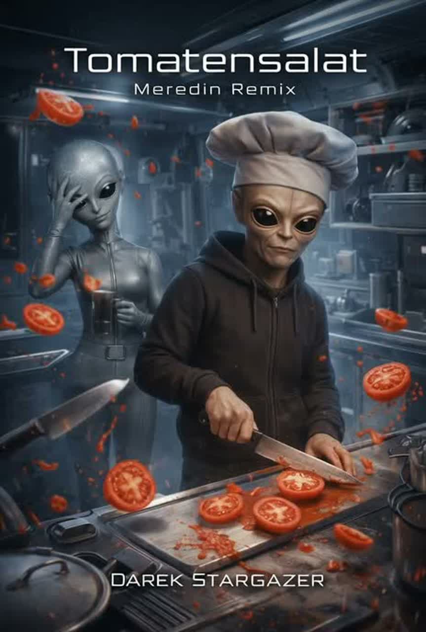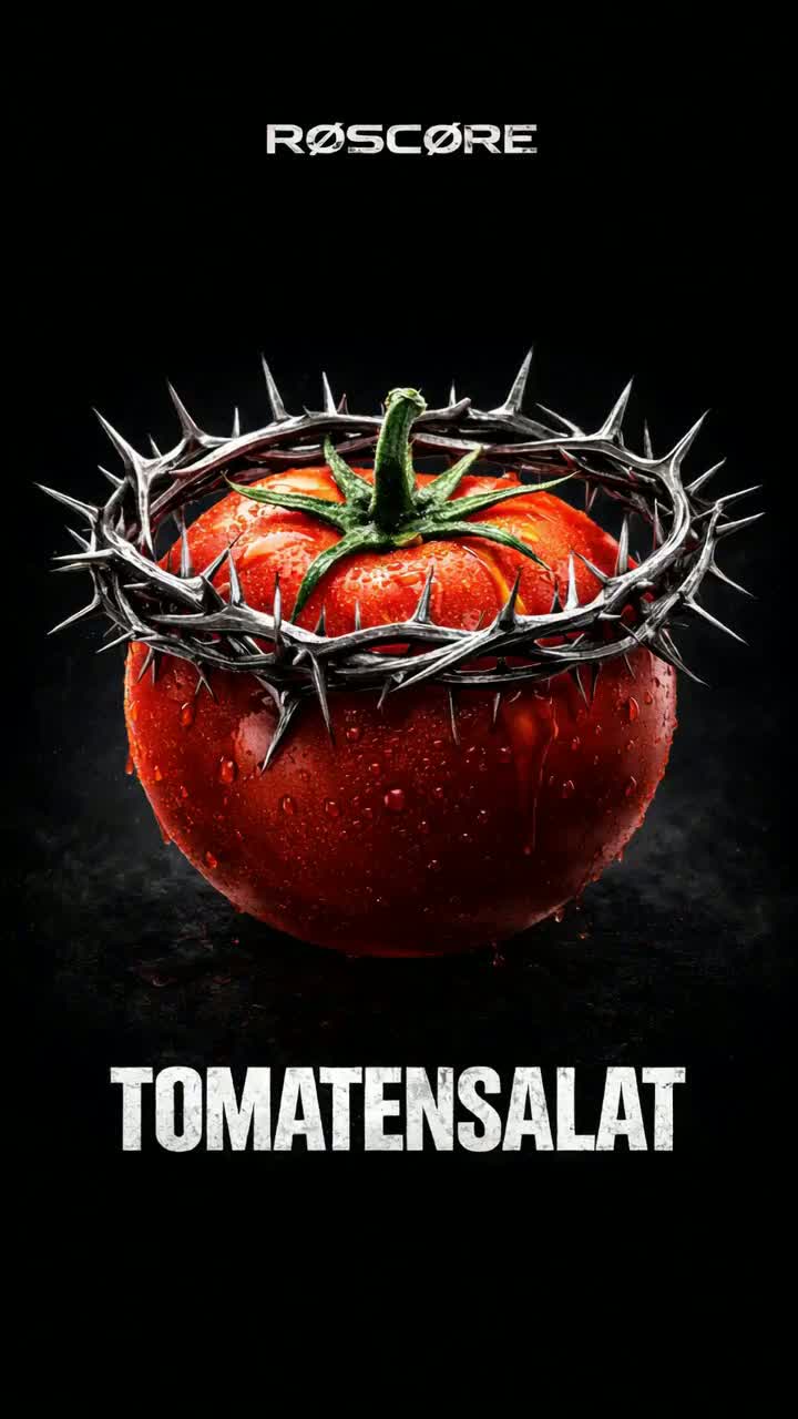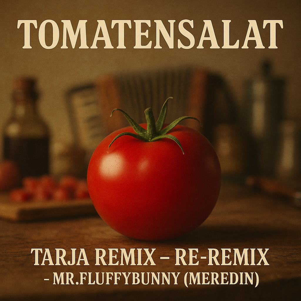 The Doom Metal track explodes as a German trap anthem with heavy 808s, sharp hi-hat rolls, and brutal kick patterns driving the beat, Aggressive rap verses spit fast and syncopated, layered with metal growl ad-libs that punch through the mix, Wah-wah guitars slash against the rhythm, distorted and dirty, while splatter and smashing tomato sound effects create absurd comic violence in the background, The chorus drops into a massive crowd chant of “Tomaaaaatensalaaaat, ” amplified by explosive guitar stabs and bass drops, Jazz-inspired scat lines cut in unexpectedly, playful and chaotic, breaking the aggression with absurd humor before the rap flow slams back in, The atmosphere is raw, menacing, and funky, a scent-driven ritual of tomato power, No onions allowed—only fat, saturated sound, crisp high-definition textures, and relentless trap percussion