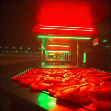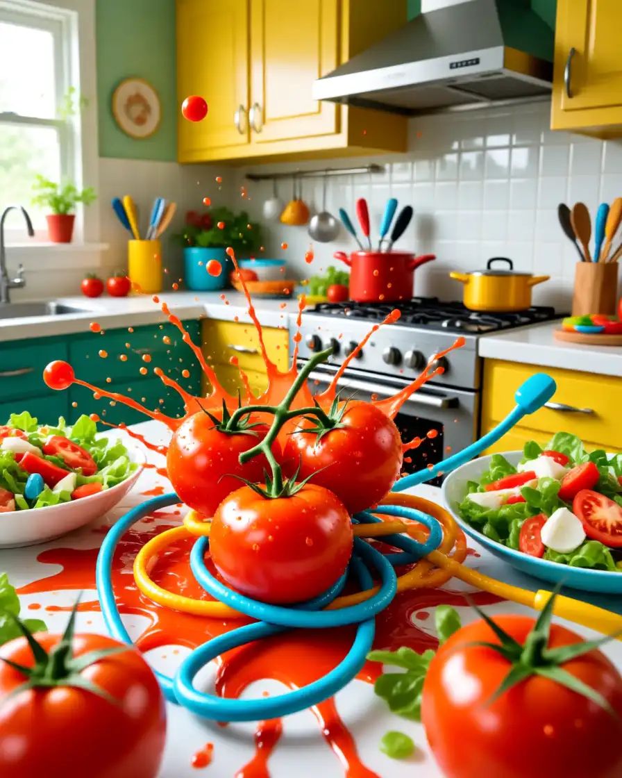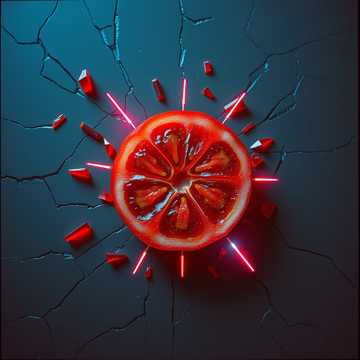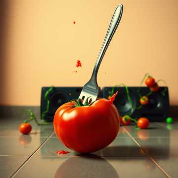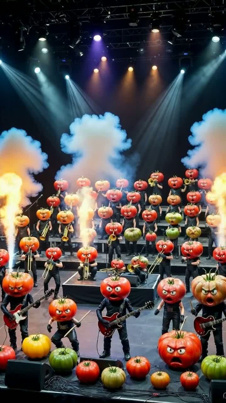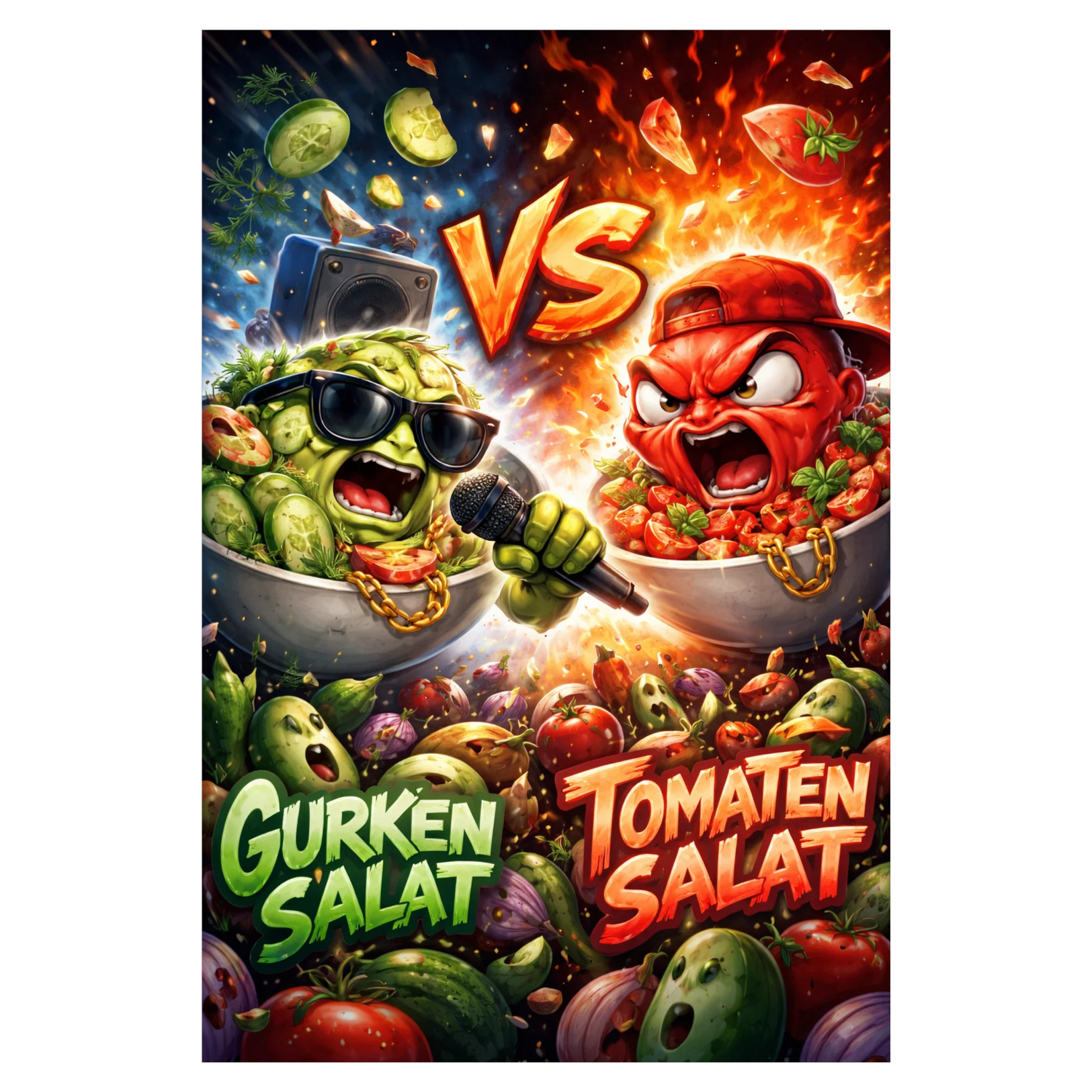 The Doom Metal track explodes as a German trap anthem with heavy 808s, sharp hi-hat rolls, and brutal kick patterns driving the beat, Aggressive rap verses spit fast and syncopated, layered with metal growl ad-libs that punch through the mix, Wah-wah guitars slash against the rhythm, distorted and dirty, while splatter and smashing tomato sound effects create absurd comic violence in the background, The chorus drops into a massive crowd chant of “Tomaaaaatensalaaaat, ” amplified by explosive guitar stabs and bass drops, Jazz-inspired scat lines cut in unexpectedly, playful and chaotic, breaking the aggression with absurd humor before the rap flow slams back in, The atmosphere is raw, menacing, and funky, a scent-driven ritual of tomato power, No onions allowed—only fat, saturated sound, crisp high-definition textures, and relentless trap percussion