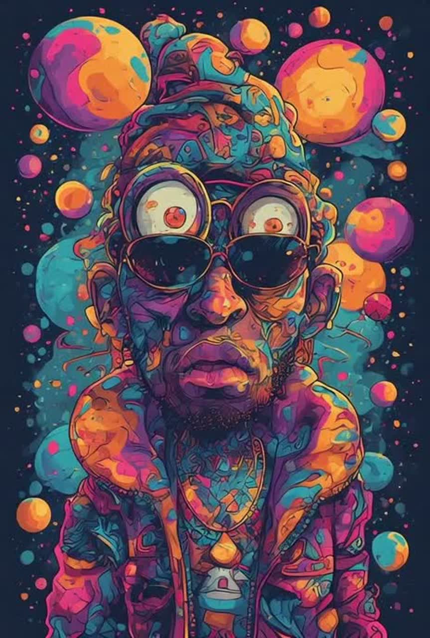 Alternative hip-hop with jazz-fusion and psychedelic pop elements, The track features a prominent, syncopated electric bassline with a warm, rounded tone, Drums consist of a crisp, dry snare and a tight kick drum with occasional syncopated fills, A clean, jazzy electric guitar provides rhythmic stabs and melodic flourishes, Lush, layered synthesizers and shimmering pads create a wide stereo field, Vocals are a mix of rhythmic rapping and melodic, harmonized singing, The arrangement includes a prominent flute solo with heavy reverb and delay, Tempo is 92 BPM in the key of G minor, The production uses frequent panning effects and occasional record scratches