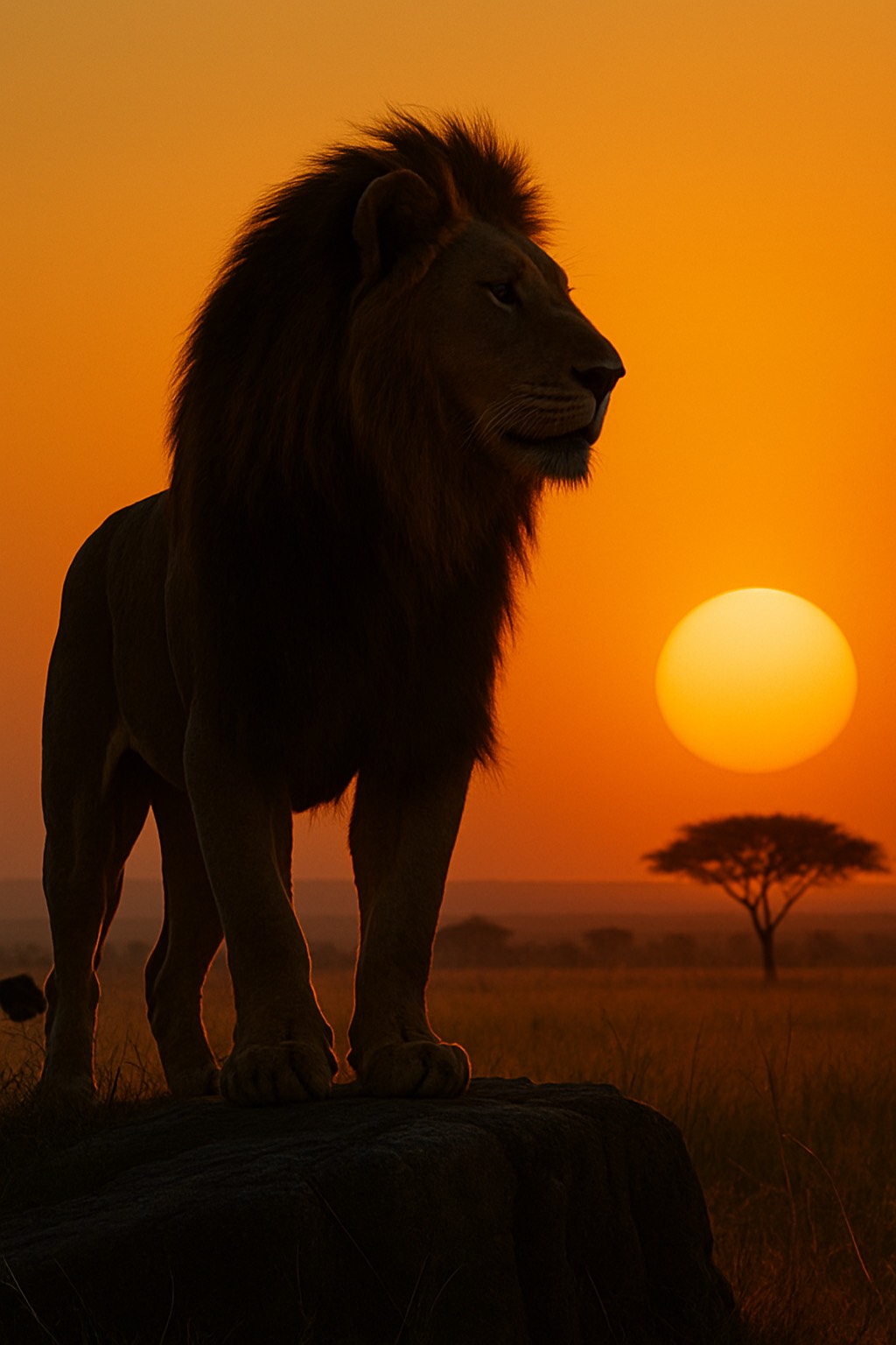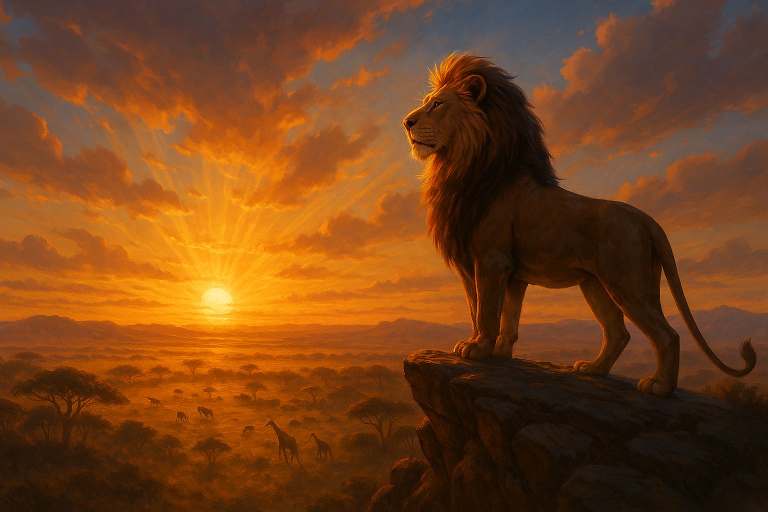 Golden savannah sunrise, slow pan over the plains, deep drums in the distance, soft children’s choir, wise elder humming, warm major chords, soaring melody over open sky, gentle wind chimes, heartbeat drums, call-and-response chanting, bittersweet nostalgia, young hero looking out over a cliff, swelling strings, sun beams through dust, proud but tender, ancient and royal, hope after tears, big final choir with long held notes, echoing roars fading into the horizon