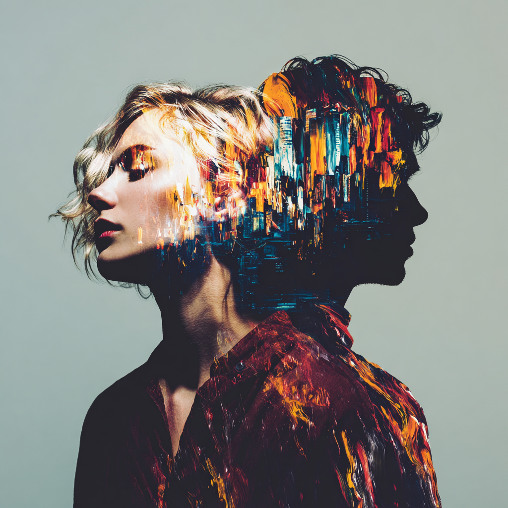 An experimental art-pop track inspired by Radiohead’s Kid A, Sparse Rhodes piano loops pulse beneath icy synth pads and glitch fragments, A clavecin plays fragile, detuned arpeggios while muted clean guitar adds dry percussive accents, Male vocals, layered and detached, chant fragmented lines about internal conflict and duality, A softly distorted bass provides a subtle undercurrent of tension, A piano enters intermittently, playing sparse, emotional notes that echo into silence, The arrangement builds slowly with overlapping textures, then unravels into static and a single unresolved piano note