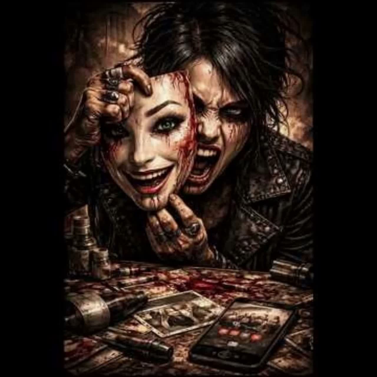 Alternative / post-hardcore track with a tense, unsettling atmosphere, Mid-tempo with stop-start rhythms, muted distorted guitars, pulsing bass, and tight controlled drums, Dark, minimal verses with space and restraint, building into sharper, heavier choruses without going full aggression, Female vocal delivery is controlled, low, and introspective, shifting between spoken, half-sung lines and sudden biting intensity, Lyrics focus on identity loss, masks, conformity, and psychological pressure, Mood is paranoid, claustrophobic, and emotionally fractured, with a sense of unease rather than rage, Clean but gritty production, emphasis on tension, dynamics, and discomfort