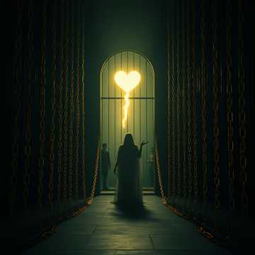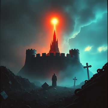 Opening with sparse, brooding acoustic guitar and dense, deep vocals, the dark doom metal track sets a heavy mood, Subtle choral textures float beneath each verse, swelling in the background, The choruses erupt with crushing harmonized guitars, thunderous percussion, and massive vocal harmonies for dramatic contrast, ‑growl, ‑choir