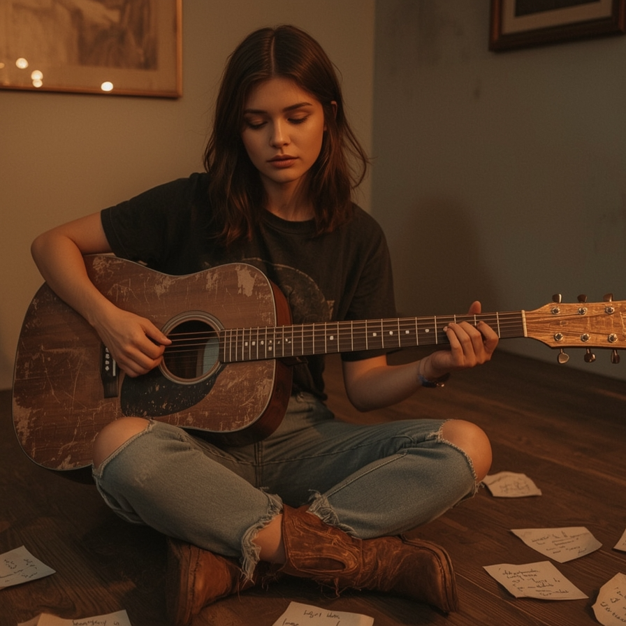 Intimate acoustic guitar leads with gentle, expressive piano accents, Dynamic female vocals shift from soft, breathy verses to powerful, resonant choruses, adding emotional depth, Minimal drums and subtle percussion carefully support the build, never overshadowing the core elements, ‑male vocals