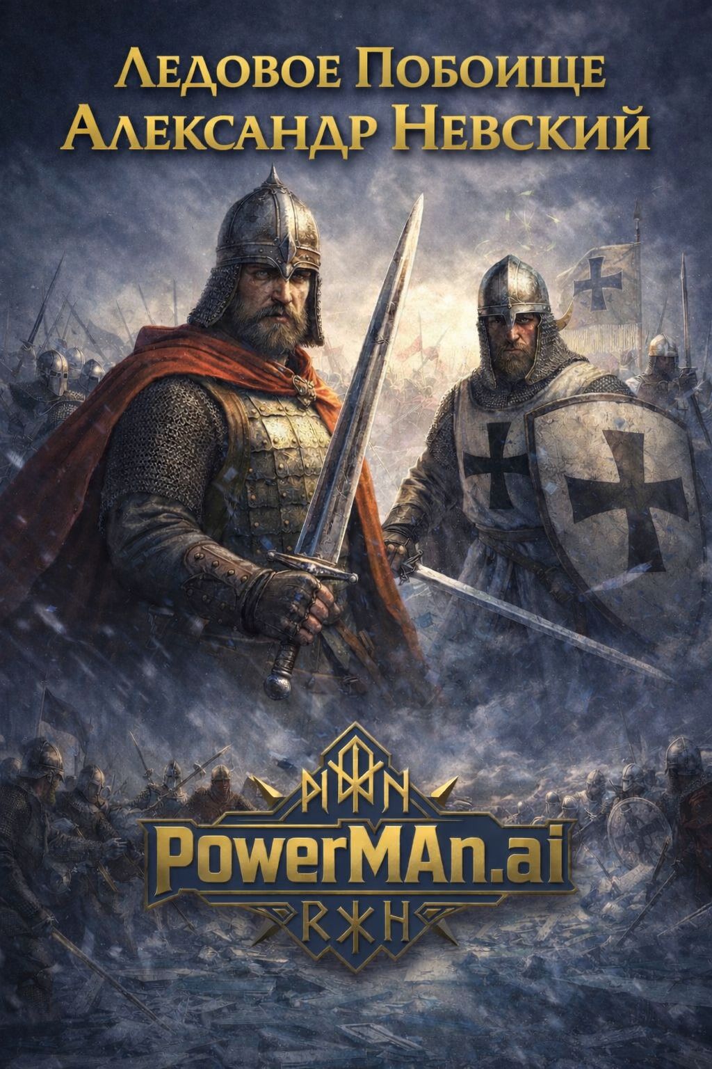 Epic symphonic metal battle opera about the Battle on the Ice (1242) and Prince Alexander Nevsky, Massive cinematic symphonic metal with powerful orchestra and huge male choir, Heavy distorted guitars, deep bass, thunderous drums, epic strings, brass, battle percussion and cathedral bells, Cold northern atmosphere, tension rising like an approaching war, Two opposing choirs: Rus army versus crusader order, singing in dialogue and confrontation, Languages in lyrics: Russian, Belarusian, Ukrainian for Nevsky’s side; German, Danish, Latvian, Estonian for the opposing army, Dramatic build-up from dark atmospheric intro to explosive symphonic metal choruses, Strong hook chorus repeated with massive choir, Battle shouts and choral chants for intensity, Mood heroic, monumental, historical, cold northern battlefield, Long cinematic development suitable for about 7 minutes with orchestral breaks and an overwhelming victorious choir finale, No pop sound, strictly epic symphonic metal