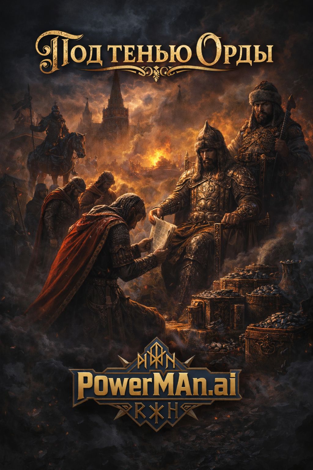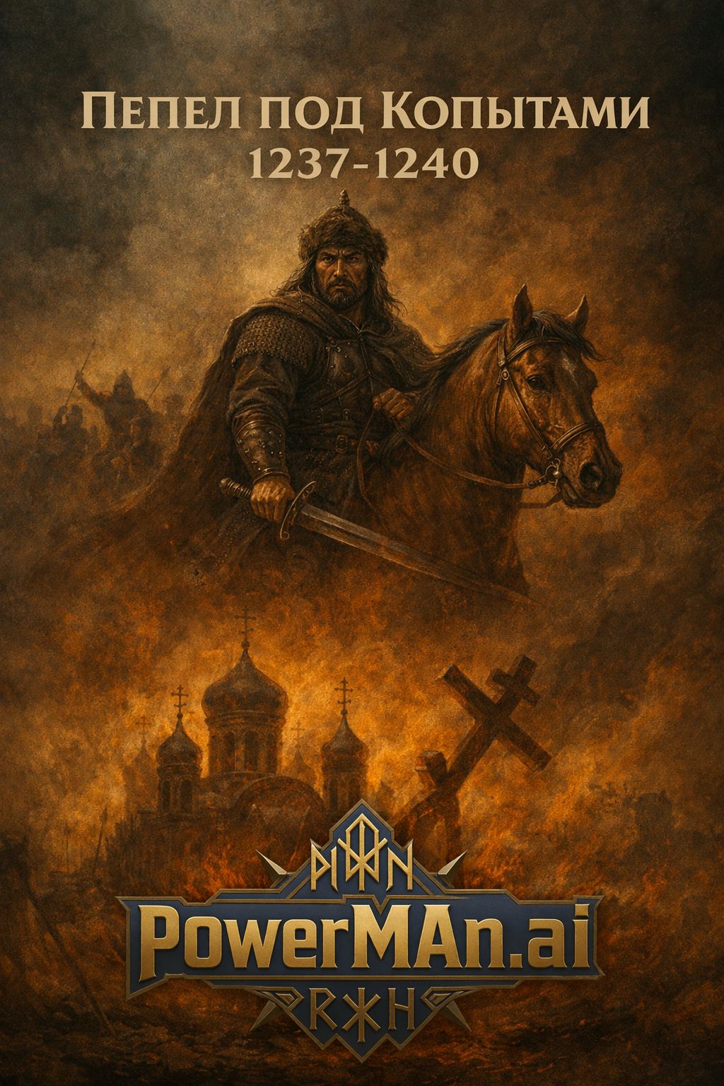 Epic symphonic metal ballad with multilingual vocals: Russian, Kazakh, and Nogai, Dark, monumental historical atmosphere, Slow to mid-tempo, minor key, Deep male lead vocals, large tragic choir, orchestral layers, heavy guitars, Include subtle throat singing textures in steppe-language parts, Lyrics depict Batu Khan’s invasion of Rus (1237–1240): fall of Ryazan, Vladimir and Kiev, fire, destruction, fate, and the establishment of Horde domination, Russian parts express tragedy and resistance, Kazakh and Nogai parts express steppe force, inevitability, and destiny, Chronicle-like tone, no modern slang, no fantasy